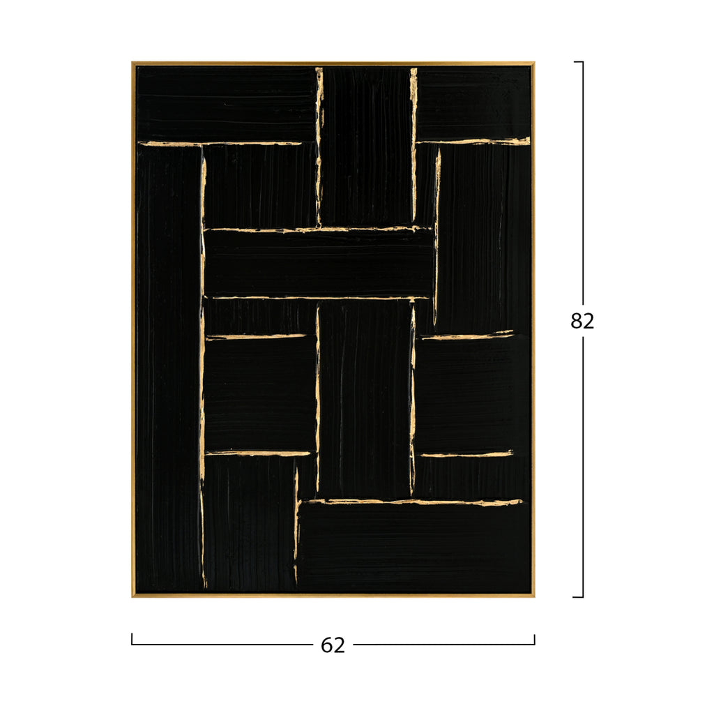 Сред всички декоративни елементи, произведенията на изкуството и особено картините играят важна роля: те не само добавят цвят и естетическа красота, но и придават дълбочина и смисъл на нашето пространство. Една картина трансформира начина, по който възприемаме пространството. Така че, украсете вашето пространство с една от новите картини, добавени към нашата гама! Тази картина е 100% ръчно рисувана върху ЧЕРНО платно със ЗЛАТНИ линии. Рамката е БЕЖОВА от полистирен. РАЗМЕРИ: 62х4,5(дебелина)х82см. КОНСТРУКТИВНИ МАТЕРИАЛИ: Полистиролът е вид твърда и солидна пластмаса. ** Цветопредаването на продукта може леко да се различава от неговото фотографско представяне на вашия екран.