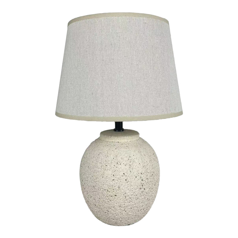 Закръглената керамична основа се отличава с фина текстура, а минималистичният ленен абажур разсейва светлината равномерно, създавайки приветлива и релаксираща атмосфера.