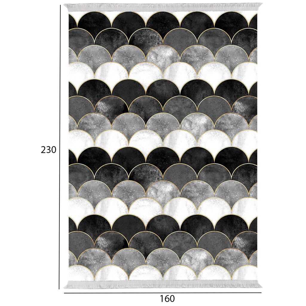ΜΜ7675.33- килим за хол------ Представяме ви новото попълнение в нашата продуктова гама. Този килим изобразява с абстрактен вид, полукръгли вълни в БЯЛ, ЧЕРЕН, СИВ цвят. Усещането за симетрия на вълните, което придава този килим, пленява окото и вълнува въображението на всеки. Информация: Килимът е част от човешката култура от векове. Най-старият съществуващ килим в света е открит в Армения и датира от 5 век пр.н.е. Разбира се, килимът с възли вероятно произхожда от 3-то или 2-ро хилядолетие пр.н.е. в Западна Азия, може би в района на Каспийско море (Северен Иран) или от Армения, въпреки че има доказателства, че кози и овце са били клани за тази цел от 7-мо хилядолетие! Килимите традиционно се правят от вълна, но от 20-ти век нататък те често се правят от синтетични влакна като полипропилен, найлон или полиестер, тъй като тези влакна са по-евтини от вълната. РАЗМЕРИ: 160Х230см Височина на купчината: 1см. Грамаж: 1300g/m2 МАТЕРИАЛИ: Повърхността на килима е изработена от 100% полиестерни влакна, а основата на килима е 100% памук. Полиестерното влакно е съкратено наименование на синтетичен, изкуствен полимер, който като специален материал най-често се нарича вид, наречен полиетилен терефталат (PET). Ясно е тогава, че е устойчив на всякакви неудобства и особено на влага. Памучната основа на килима също е много устойчива на влага. ПОДДРЪЖКА: Благодарение на издръжливите строителни материали, този килим може да се пере без страх под течаща вода с меки препарати, като препарат за миене на съдове. Разбира се, на пазара има и специални препарати за почистване на всякакви килими, които можете да използвате без страх. Само внимавайте да не изтъркате долната част, която е памучна, а я измийте само с вода. ПРЕДИМСТВА: Този килим с ресни, както всичко в нашата гама, е готов за работа. Той е издръжлив благодарение на индустриалната си конструкция и синтетичните материали, които го изграждат и по същата причина има способността да запази цвета си непроменен. И разбира се, цената му е наистина атрактивна. Просто се уверете, че го вписвате естетически във вашето пространство!