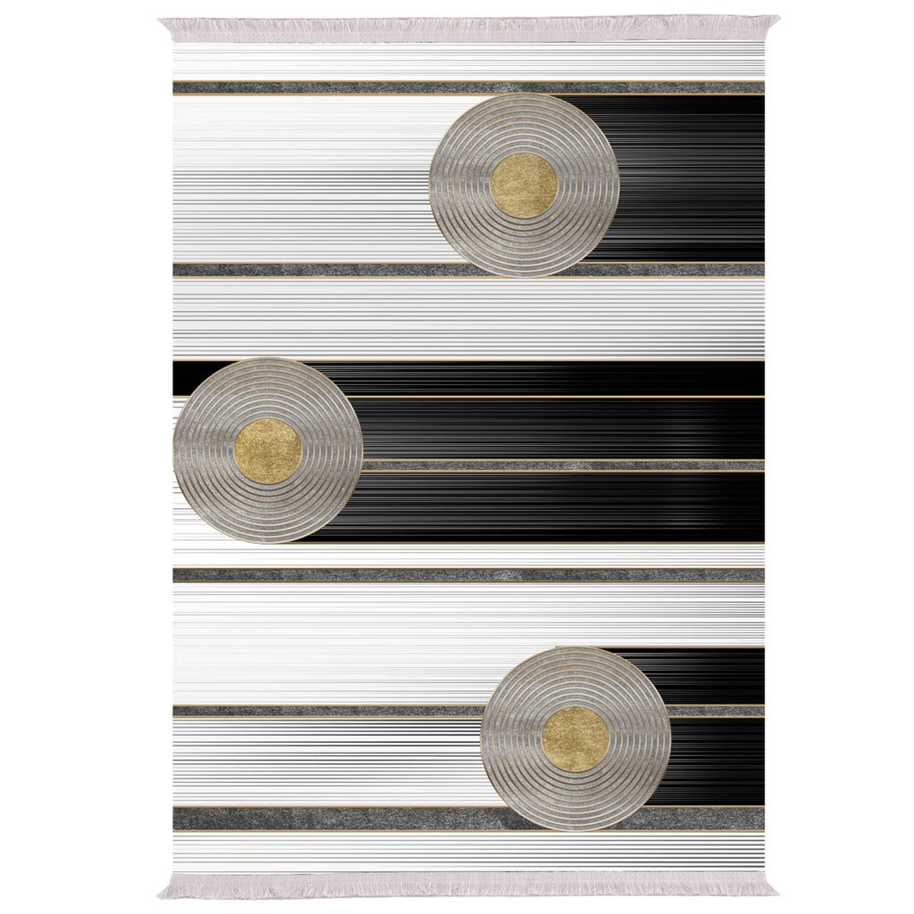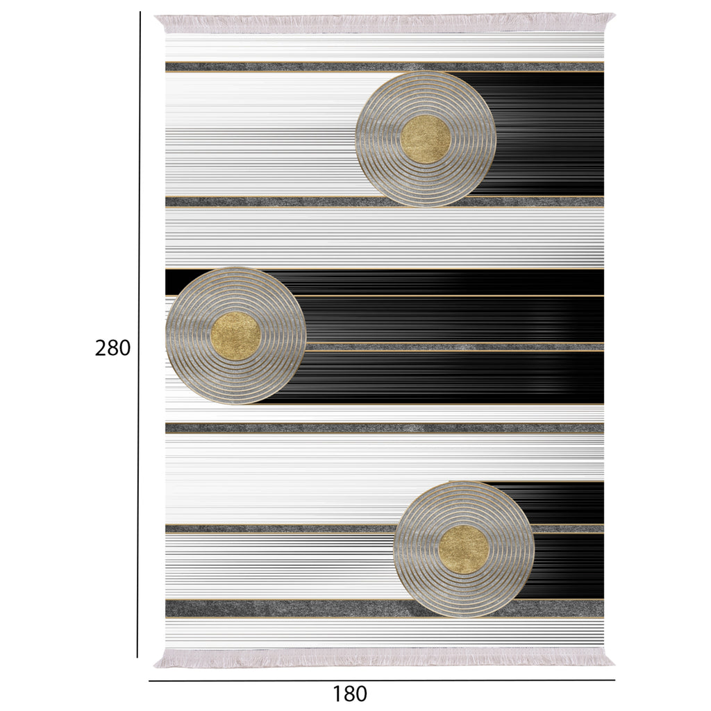 Представяме ви новото попълнение в нашата продуктова гама. Серията килими JOSIANE. Този конкретен килим е модерен от който и ъгъл да го погледнете. Доминиращите му цветове са бяло, сиво, черно и златно. Силната му черта са белите дискове със златни центрове, които дават усещане за левитация и движение и разбира се ще предизвика интерес с особената детайлност и симетрия на линиите. Определено ще надстрои хола ви. Информация: Килимът е част от човешката култура от векове. Най-старият съществуващ килим в света е открит в Армения и датира от 5 век пр.н.е. Разбира се, килимът с възли вероятно произхожда от 3-то или 2-ро хилядолетие пр.н.е. в Западна Азия, може би в района на Каспийско море (Северен Иран) или от Армения, въпреки че има доказателства, че кози и овце са били клани за тази цел от 7-мо хилядолетие! Килимите традиционно се правят от вълна, но от 20-ти век нататък те често се правят от синтетични влакна като полипропилен, найлон или полиестер, тъй като тези влакна са по-евтини от вълната. РАЗМЕРИ: 180Х280см Височина на купчината: 1см. Грамаж: 1300g/m2 МАТЕРИАЛИ: Повърхността на килима е изработена от 100% полиестерни влакна, а основата на килима е 100% памук. Полиестерното влакно е съкратено наименование на синтетичен, изкуствен полимер, който като специален материал най-често се нарича вид, наречен полиетилен терефталат (PET). Ясно е тогава, че е устойчив на всякакви неудобства и особено на влага. Памучната основа на килима също е много устойчива на влага. ПОДДРЪЖКА: Благодарение на издръжливите строителни материали, този килим може да се пере без страх под течаща вода с меки препарати, като препарат за миене на съдове. Разбира се, на пазара има и специални препарати за почистване на всякакви килими, които можете да използвате без страх. Само внимавайте да не изтъркате долната част, която е памучна, а я измийте само с вода. ПРЕДИМСТВА: Този килим с ресни, в особено модерен стил, като всичко в нашата гама, е готов за работа. Той е издръжлив благодарение на индустриалната си конструкция и синтетичните материали, които го изграждат и по същата причина има способността да запази цвета си непроменен. И разбира се, цената му е наистина атрактивна. Просто се уверете, че го вписвате естетически във вашето пространство!