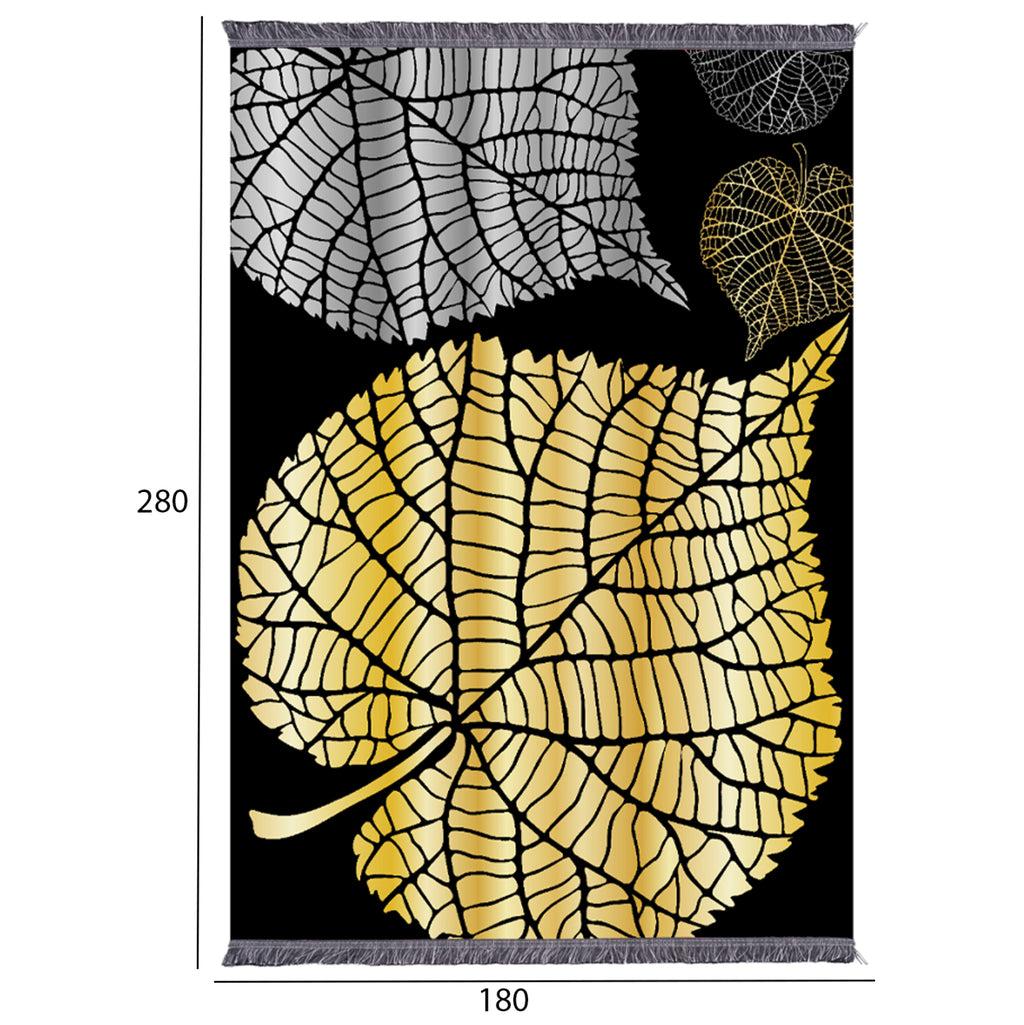 Килим за хол изобразява дървесни листа в жълто и сиво на черен фон.