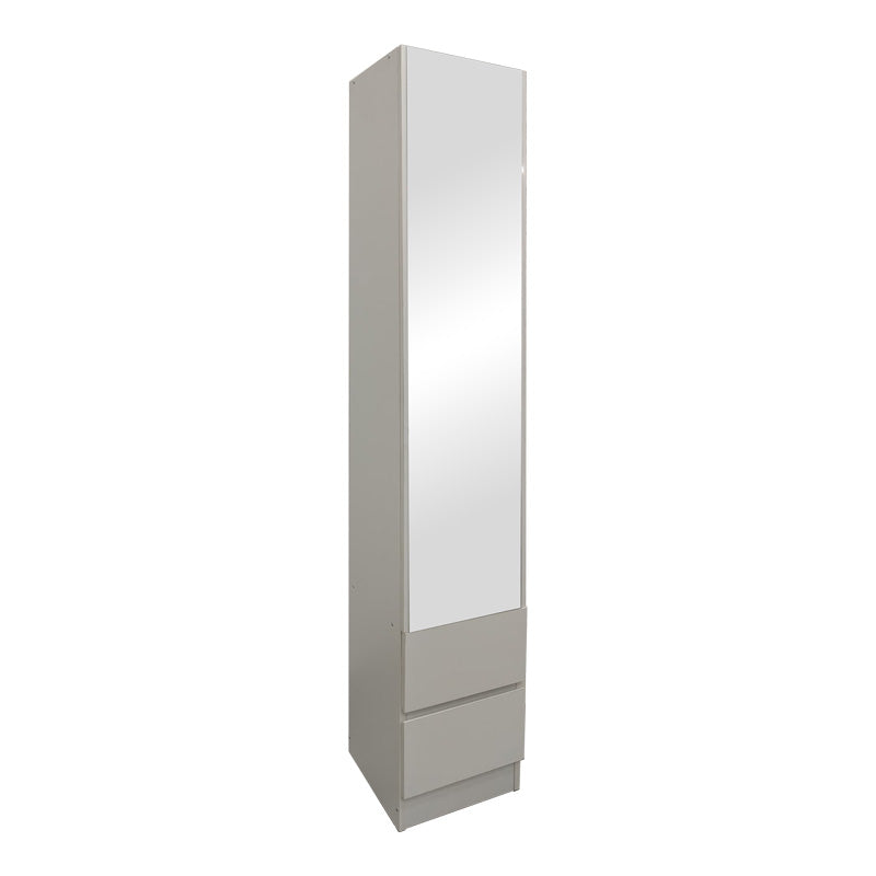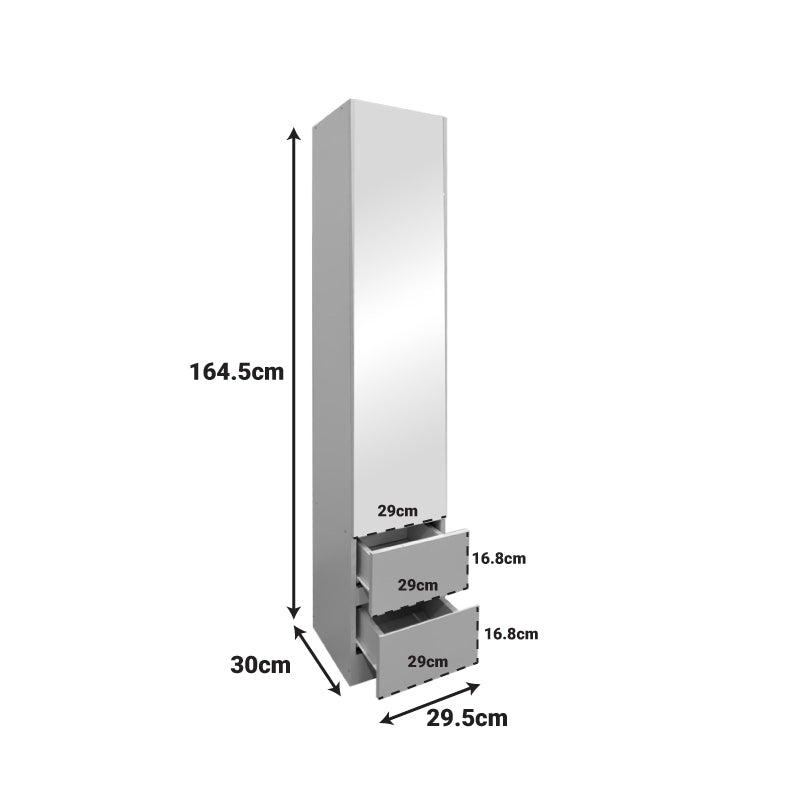 Висок шкаф за баня Lostro с огледало – бяло покритие Елегантният и функционален висок шкаф за баня Lostro е отлично допълнение към всяка модерна баня. Разполага с вградено огледало в цяла височина на вратата, което предлага практичност, като същевременно визуално разширява пространството. С достатъчно място за съхранение на кърпи, козметика и други аксесоари за баня, той помага за поддържането на организирана и подредена среда. Неговият елегантен, минималистичен дизайн го прави достатъчно универсален, за да допълни различни стилове на декорация на баня. Технически характеристики: Изработен от 15 мм ПДЧ с висококачествено меламиново покритие, устойчиво на износване, повреди и време. Предлага се в бял цвят. Размери на продукта: Ширина: 29,5 см Дълбочина: 30 см Височина: 164,5 см Забележки: Продуктът се доставя несглобен, в оригиналната си фабрична опаковка и включва подробно ръководство за сглобяване. Действителният цвят на продукта може леко да се различава от фотографското му изображение поради осветлението и настройките на екрана.