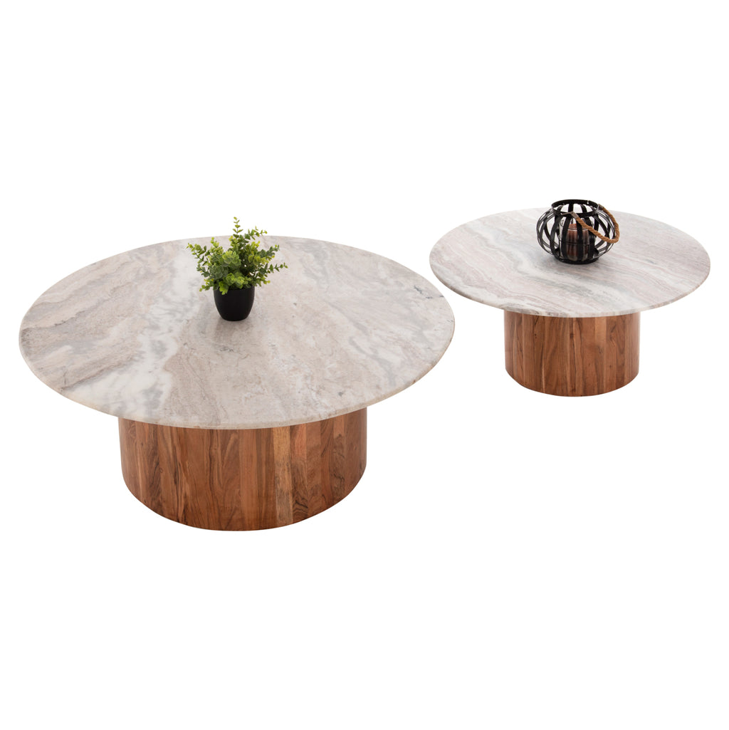 ΜΜ11915 е комплект от 2 масички за кафе FORMEL в големи и малки размери, които са сред новите попълнения в нашата гама. Това е луксозна кръгла маса с цилиндрична дървена основа в ЕСТЕСТВЕН дървесен цвят. Повърхността е изработена от мрамор в различни светли цветове. Комбинацията е наистина нещо уникално и впечатляващо. Идеална както за дома, така и за професионални пространства. РАЗМЕРИ: Голяма: Φ100x40Y см. Малка: Φ80x36Y см. СТРОИТЕЛНИ МАТЕРИАЛИ: Масите са изработени от масивна акациева дървесина, докато повърхността е от мрамор. Когато говорим за масивна дървесина, имаме предвид дървесината, която е направена изцяло от дървесния ствол. Масивната дървесина е най-скъпият избор от дървесни видове, но се откроява с вечната си естетика. --- Съществуващите пукнатини или тези, които могат да се образуват с течение на времето, се дължат на свиването-разширяването на живия организъм, наречен масивна дървесина, и не представляват строителен дефект, придавайки оригиналност и уникален дизайн на вашето пространство. По време на производствения процес съществуващите пукнатини се униформяват и стабилизират с материал, изработен от същата дървесина. Следователно, може да има цветови вариации и разлики в размерите на продукта, дължащи се на размерите на обработената дървесина. Те не представляват дефект на продукта. *Всяка мраморна повърхност е различна по своя цвят поради уникалността на всяко парче. ПОДДРЪЖКА: Мраморът се почиства лесно с влажна кърпа. В случай на петна, трябва да го избършете бързо, преди байцът да го „накисне“. Основата от акация е много издръжлива, но ако желаете, можете да я покриете със специални лакове, които се предлагат в търговската мрежа за по-голяма издръжливост. *Масите се доставят несглобени във фабрична опаковка. ** Цветопредаването на продукта може леко да се различава от фотографското му представяне на вашия екран. „Търговска марка“