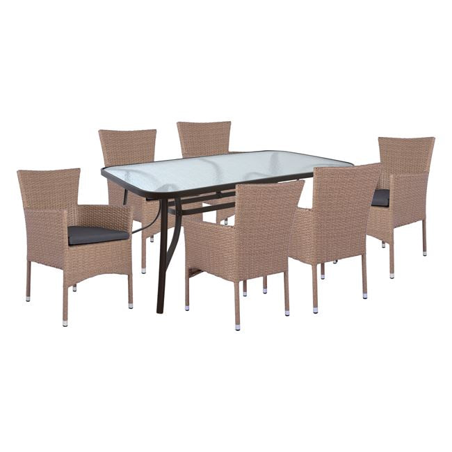 КОМПЛЕКТЪТ ВКЛЮЧВА Метална външна маса в цвят кафе с вградено безопасно стъкло. Размери: 160х90х72см. Шест външни фотьойла, изработени от метална конструкция, покрита с плетена ракита в кафяво-мока нюанс. Размери: 58x59x84H см. Ракитата има голяма устойчивост на високи и ниски температури от (-85c до +85c.), обогатена е и с UV стабилизатор за слънчевите лъчи. Идеален комплект за бизнес помещения, но и за вашия дом, той ще ви даде комфорт и почивка.