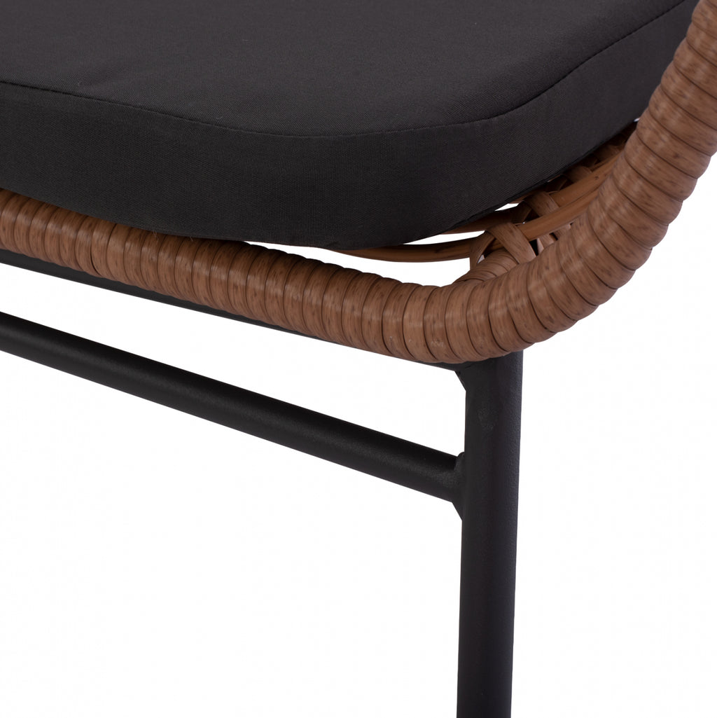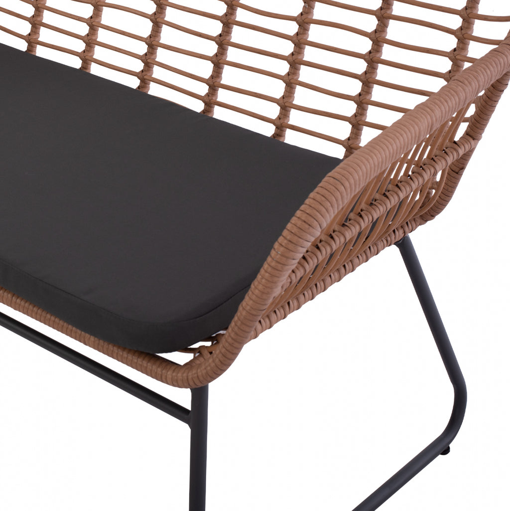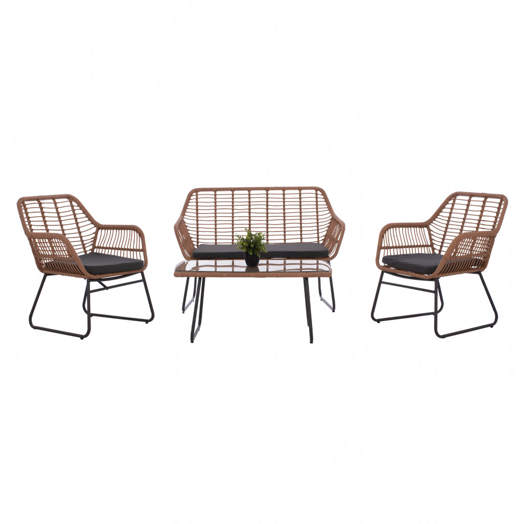 Пълна външна холова гарнитура 4 бр., изработена от метална конструкция в тъмно сив цвят, с тапицерия от ракита в бежов нюанс и платнени възглавници с цип в сив цвят. Комплектът включва: 1 двуместен диван, 2 фотьойла и 1 стъклена маса. Ракитата има голяма устойчивост на високи и ниски температури от (-85c до +85c.), обогатена е и с UV стабилизатор за слънчевите лъчи. Идеален за трапезария, но и за вашия дом, той ще ви даде комфорт и релакс. Размери на дивана: 120x69x85 см. Размери на седалката: 94х50 см. Размери на гърба: 108х48см. Височина на седалката: 43 см. Височина на ръцете: 63 см. Размери на фотьойла: 66x69x85 см. Размери на седалката: 47х50 см. Размери на гърба: 57х47см. Височина на седалката: 43 см. Височина на ръцете: 63 см. Размери на масата: 95х55х55 см. Дебелина на възглавницата: 5см.