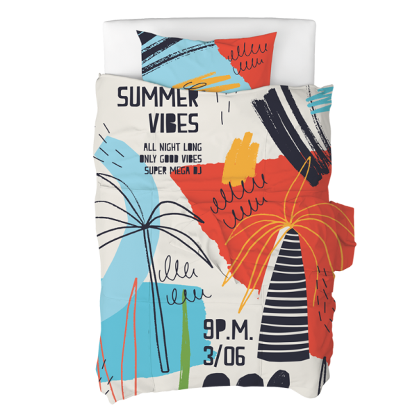Практичен и стилен комплект, изработен от микрофибърна материя, устойчива на петна, с висококачествени UV щампи. Кувертюрата съдържа 130 g/m² термо влакна за оптимален комфорт. Материалите са антибактериални, антиалергични и антиканцерогенни, без вредни вещества. Препоръчва се химическо чистене за възглавниците и кувертюрата, а чаршафът може да се пере в пералня. Съдържа дълга възглавница (105x30 см), възглавница (90x43 см), калъфка (70x50 см), тънка завивка/пике (140x210 см) и чаршаф с ластик (152x252 см).