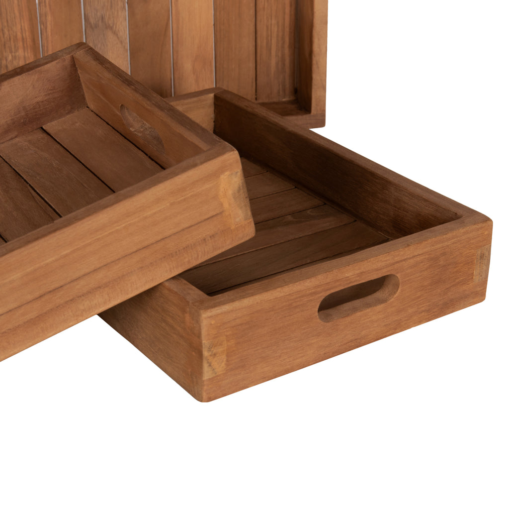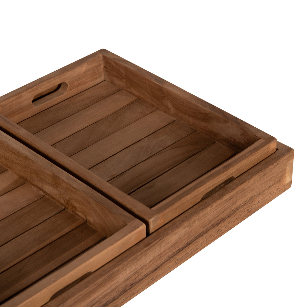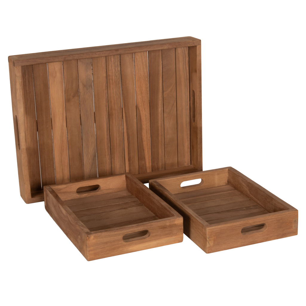 Комплектът дискове MH7894 от 3 части е едно от новите попълнения в нашата гама. Състои се от една по-голяма и 2 по-малки табли за сервиране на маса, изработени от качествена дървесина в НАТУРАЛЕН цвят. Идеален избор за обогатяване на вашето домашно оборудване с набор от несравнимо качество и стил. РАЗМЕРИ: 39х29х7 см. (когато малките дискове се поставят в големия) Голям: 39x29x5 см. Дълбочина на тавата: 3,5см. Малък: 26x18x5 см. (x2) Дълбочина на таблата: 3,5 см. МАТЕРИАЛИ НА ИЗРАБОТКА: Комплектът е изработен от ТИКОВО дърво с отлично качество. Тиковото дърво е най-популярният вид твърда дървесина. Той е жълт до тъмно кафяв на цвят, изключително тежък, с висока якост, устойчив на атмосферни влияния, устойчив на стружки и не се разлага. Често водите на дървото му са силни и прави. Използва се за различни вътрешни и външни конструкции. Освен това е преминал специална обработка за още по-голяма устойчивост на влага (на водна основа). ПОДДРЪЖКА: Необходимо е само почистване от прах и при необходимост почистване с влажна кърпа.