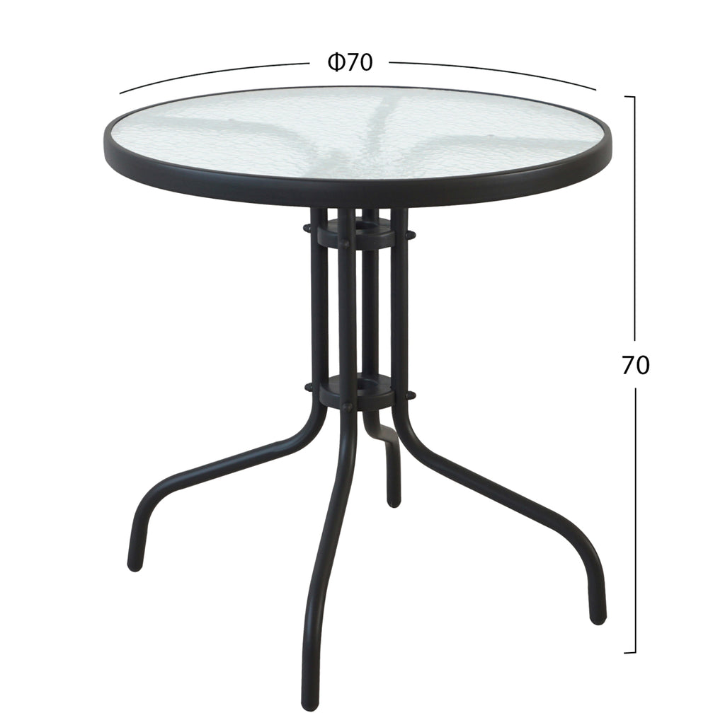 Този комплект се състои от 2 ЧЕРНИ метални стола с текстил на облегалката и седалката и кръгла маса в ЧЕРНО, с полупрозрачен плот от безопасно стъкло. Стъклената повърхност лежи върху метална колона с 4 крака с красива извита подредба. Столовете са леки и като цяло този комплект е идеален за ограничени пространства като тераси и малки дворове. РАЗМЕРИ: Маса: Φ70x70Y см. Столове: 55x58x72H см. Размери на седалката: 36х36 см. Размери на гърба: 30х31см. Височина на ръцете: 63 см. Височина на седалката: 43 см. Височина на крака: 39 см. Разстояние между краката: 50х58,5 см. Разстояние задни крака: 44,5 см. ПОДДРЪЖКА: Достатъчно е забърсване с влажна кърпа или дори със специални почистващи препарати. *Масата се доставя разглобена ** Цветопредаването на продукта може леко да се различава от фотографското представяне на вашия екран.