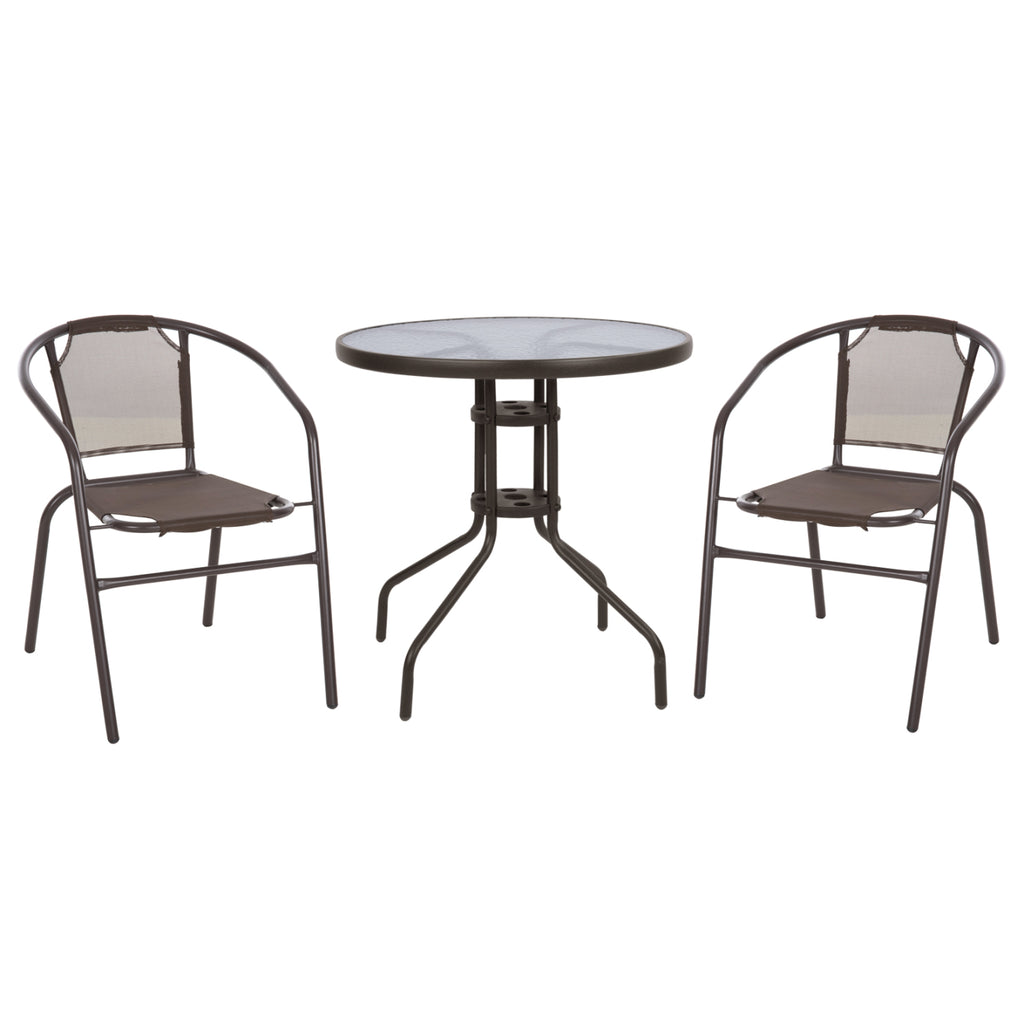 Този комплект се състои от 2 КАФЯВИ метални стола с текстилна облегалка и седалка и КАФЯВА кръгла маса с полупрозрачен плот от безопасно стъкло. Стъклената повърхност лежи върху метална колона с 4 крака с красива извита подредба. Столовете са леки и като цяло този комплект е идеален за ограничени пространства като тераси и малки дворове. РАЗМЕРИ: Маса: Φ70x70Y см. Столове: 55x58x72H см. Размери на седалката: 36х36 см. Размери на гърба: 30х31см. Височина на ръцете: 63 см. Височина на седалката: 43 см. Височина на крака: 39 см. Разстояние между краката: 50х58,5 см. Разстояние задни крака: 44,5 см. ПОДДРЪЖКА: Достатъчно е забърсване с влажна кърпа или дори със специални почистващи препарати. *Масата се доставя разглобена ** Цветопредаването на продукта може леко да се различава от фотографското представяне на вашия екран.