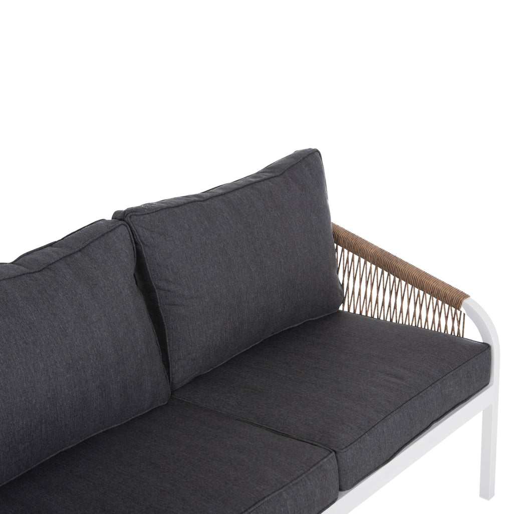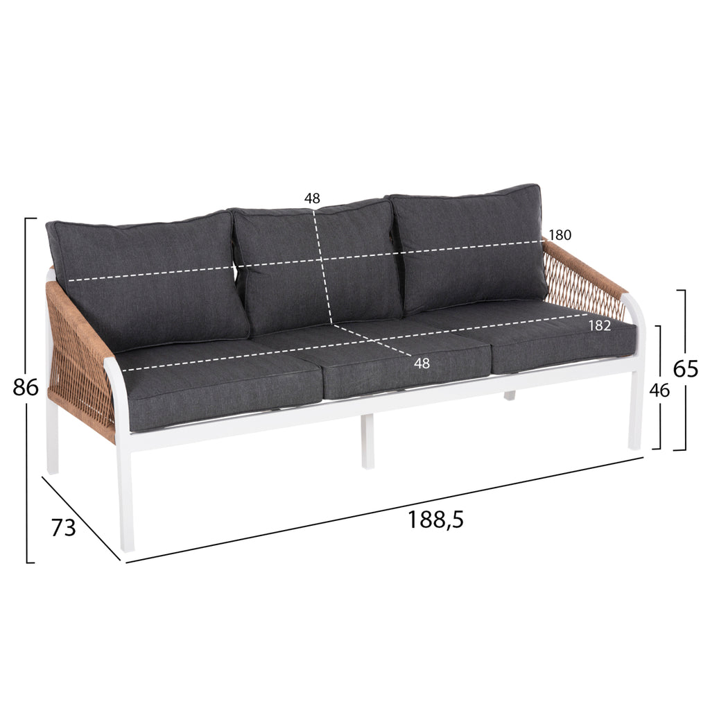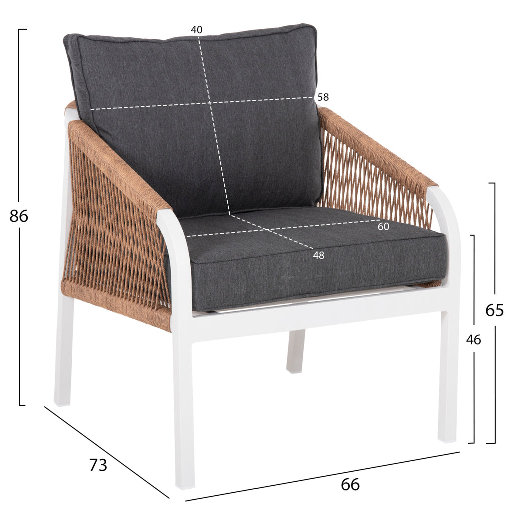 Представяме ви ефектната и нова външна холова гарнитура MAERLY в цвят БЯЛО, с холна маса, 2 фотьойла и 1 тройка. Комплект, който ще обикнете от пръв поглед. Рамката на целия комплект е алуминиева, покрита със синтетично въже в БЕЖОВ цвят. Техният дизайн е красив за гледане, докато тяхната здравина е очевидна. Седалката на дивана и фотьойлите е широка, а облегалката им обгръща тялото, което повишава комфорта, който предлагат, съчетан с удобните възглавници както на седалката, така и на облегалката. Триместният диван в подобен дизайн обаче е най-впечатляващата част от този комплект с големите си размери, които го правят отправна точка. Възглавниците в целия комплект са покрити с полиестерен плат в цвят CARBON и са с пълнеж от дунапрени със средна твърдост за максимално удобство, както и с ципове. Какво повече може да поиска някой, за да обнови екстериора на своя бизнес? РАЗМЕРИ: Размери на дивана: 188.5x73x86Y см.--Височина на седалката: 46 см.---Височина подлакътници: 65 см. Размери на фотьойла: 66x73x86Y см.--Височина на седалката: 46 см.---Височина подлакътници: 65 см. Размери на масата: 109x56.5x41Y см. Дебелина на седалната възглавница: 6см. Спецификации на алуминия: Φ25xT1.5mm Спецификации на синтетичното въже: Φ21mm КОНСТРУКТИВЕН МАТЕРИАЛ: Целият комплект е изработен от алуминий с електростатично боядисване. Алуминият е метал с отлични механични свойства и много устойчив на различни форми на корозия по природа и изисква минимални разходи за поддръжка. Може да се рециклира неограничено време, запазвайки характеристиките си без влошаване на качеството. Електростатичното боядисване е процес на сухо покритие, използван като метално покритие чрез електростатичен процес, който след това се „свързва“ към метала чрез топлина. Подходящ е както за вътрешни, така и за външни приложения. ПОДДРЪЖКА: Идеалното за поддръжка на алуминий е използването на много мека кърпа или гъба, обилно количество вода и мек почистващ продукт, като например препарат за миене на съдове. Алуминиевите мебели нямат специални изисквания за поддръжка, тъй като не корозират. **Точното цветопредаване на продукта може леко да се различава от действителния продукт поради различни настройки на монитора.