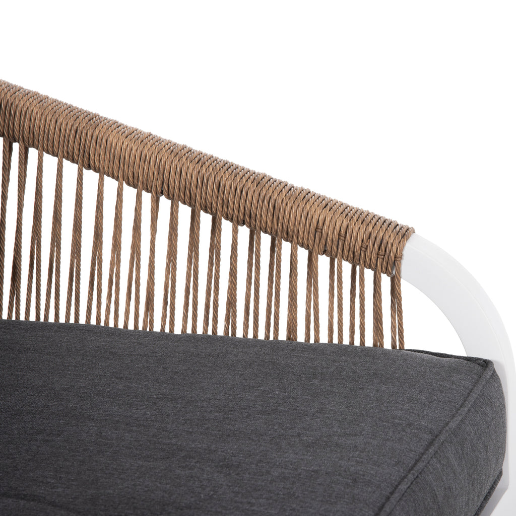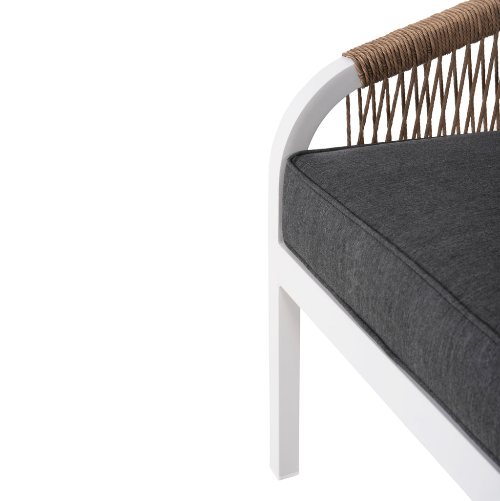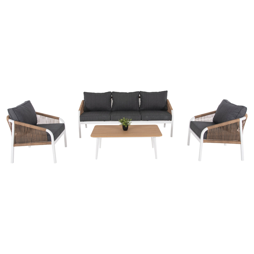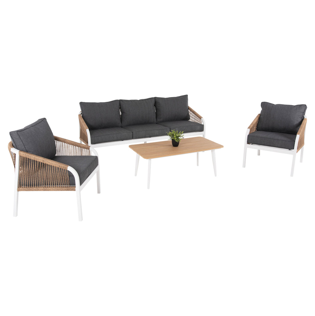Представяме ви ефектната и нова външна холова гарнитура MAERLY в цвят БЯЛО, с холна маса, 2 фотьойла и 1 тройка. Комплект, който ще обикнете от пръв поглед. Рамката на целия комплект е алуминиева, покрита със синтетично въже в БЕЖОВ цвят. Техният дизайн е красив за гледане, докато тяхната здравина е очевидна. Седалката на дивана и фотьойлите е широка, а облегалката им обгръща тялото, което повишава комфорта, който предлагат, съчетан с удобните възглавници както на седалката, така и на облегалката. Триместният диван в подобен дизайн обаче е най-впечатляващата част от този комплект с големите си размери, които го правят отправна точка. Възглавниците в целия комплект са покрити с полиестерен плат в цвят CARBON и са с пълнеж от дунапрени със средна твърдост за максимално удобство, както и с ципове. Какво повече може да поиска някой, за да обнови екстериора на своя бизнес? РАЗМЕРИ: Размери на дивана: 188.5x73x86Y см.--Височина на седалката: 46 см.---Височина подлакътници: 65 см. Размери на фотьойла: 66x73x86Y см.--Височина на седалката: 46 см.---Височина подлакътници: 65 см. Размери на масата: 109x56.5x41Y см. Дебелина на седалната възглавница: 6см. Спецификации на алуминия: Φ25xT1.5mm Спецификации на синтетичното въже: Φ21mm КОНСТРУКТИВЕН МАТЕРИАЛ: Целият комплект е изработен от алуминий с електростатично боядисване. Алуминият е метал с отлични механични свойства и много устойчив на различни форми на корозия по природа и изисква минимални разходи за поддръжка. Може да се рециклира неограничено време, запазвайки характеристиките си без влошаване на качеството. Електростатичното боядисване е процес на сухо покритие, използван като метално покритие чрез електростатичен процес, който след това се „свързва“ към метала чрез топлина. Подходящ е както за вътрешни, така и за външни приложения. ПОДДРЪЖКА: Идеалното за поддръжка на алуминий е използването на много мека кърпа или гъба, обилно количество вода и мек почистващ продукт, като например препарат за миене на съдове. Алуминиевите мебели нямат специални изисквания за поддръжка, тъй като не корозират. **Точното цветопредаване на продукта може леко да се различава от действителния продукт поради различни настройки на монитора.