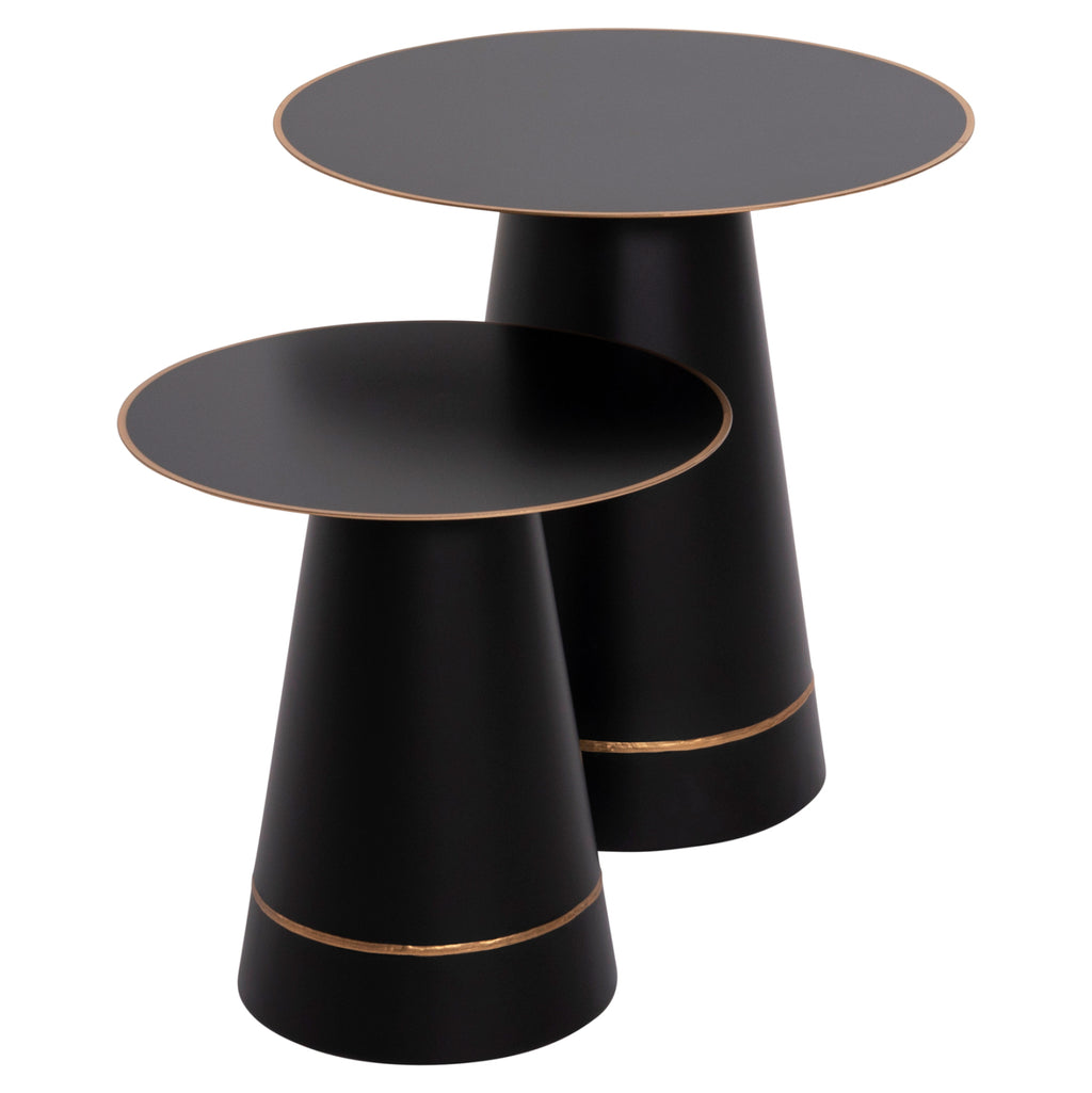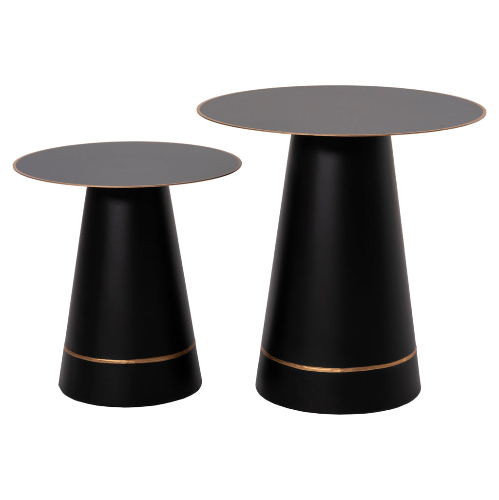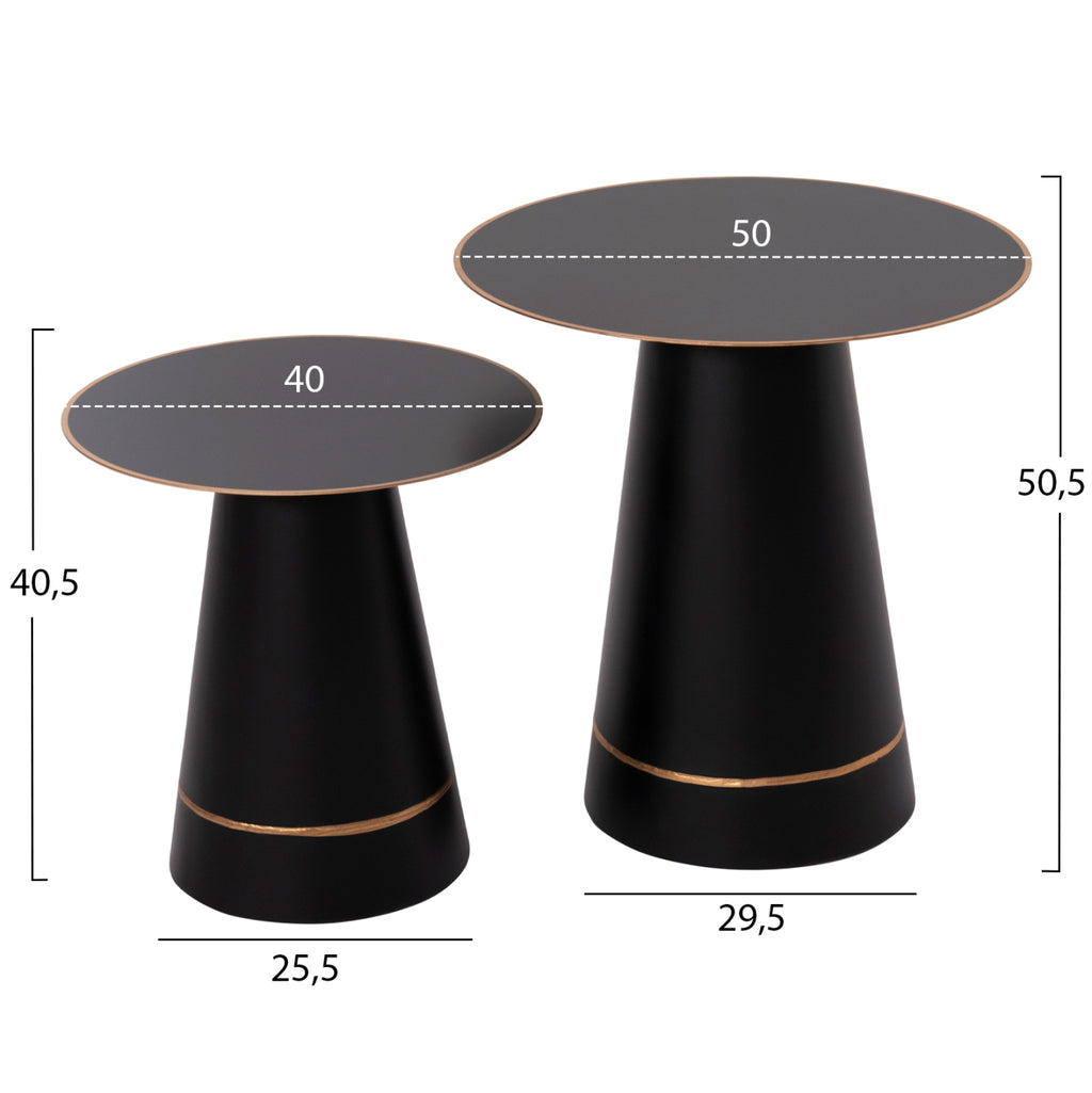 Холната маса BALLI от 2 е едно от новите попълнения в нашата гама. Това са 2 кръгли метални маси с конична основа и плоски повърхности в цвят ЧЕРЕН мат. Златните детайли както по повърхностите, така и по основите придават красив вид на масите. Идеален както за дома, така и за бизнес помещения. РАЗМЕРИ: Височина: Φ50x50.5H см.---Основа: Φ29.5см. Ниска: Φ40x40,5H см.---Основа: Φ25,5 см. ПОДДРЪЖКА: За полиране на масите е достатъчно забърсване с влажна кърпа. ** Цветопредаването на продукта може леко да се различава от неговото фотографско представяне на вашия екран.