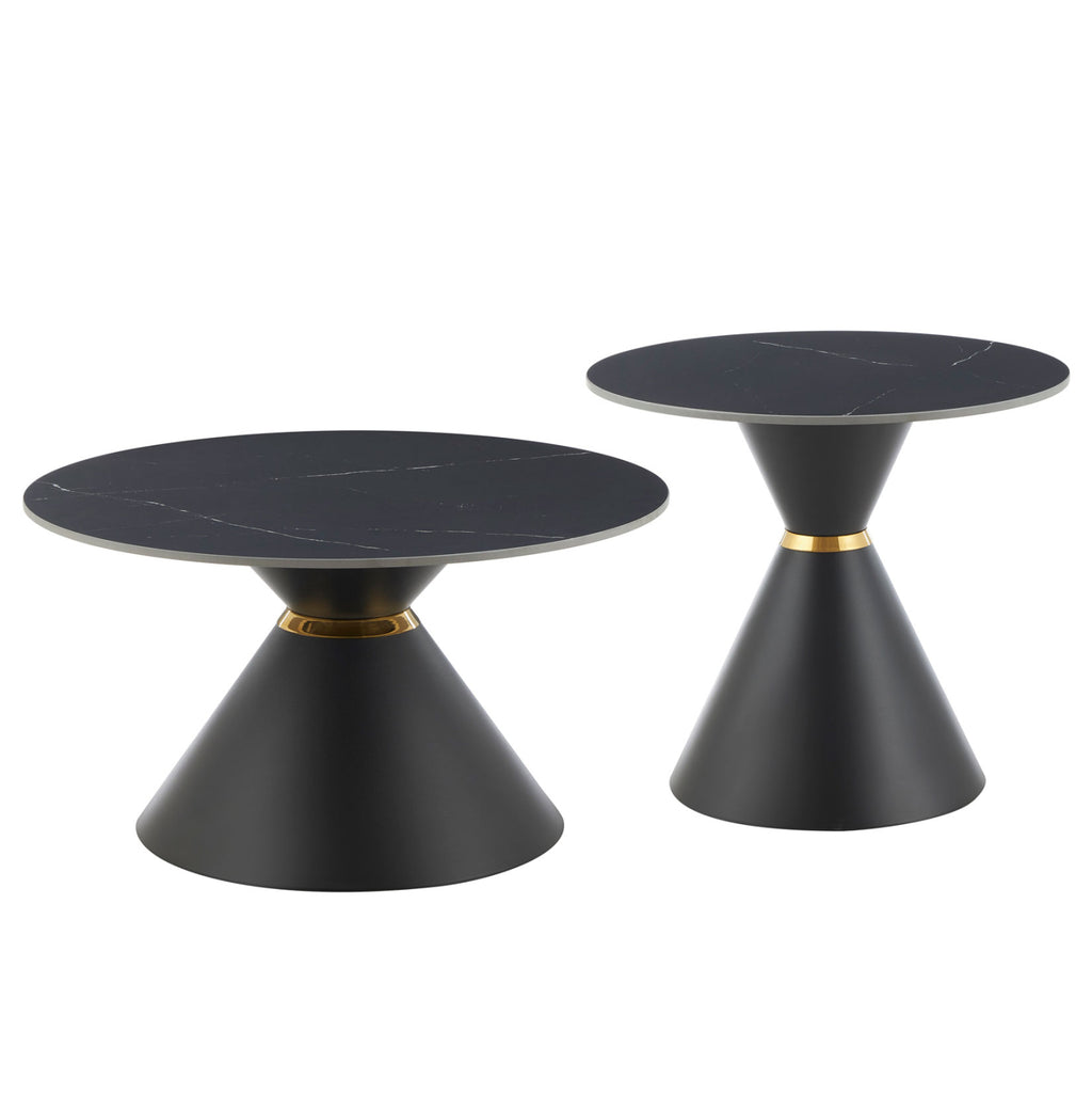 Комплектът от 2 маси NANDO за хола ще бъде прекрасно допълнение към вашето пространство. Това са 2 кръгли метални маси с различни размери с ЧЕРНИ основи във формата на коничен пясъчен часовник със златна “шийка”. Повърхностите са гладка керамика с БЯЛ мраморен вид. Идеални както за дома, така и за професионални пространства.