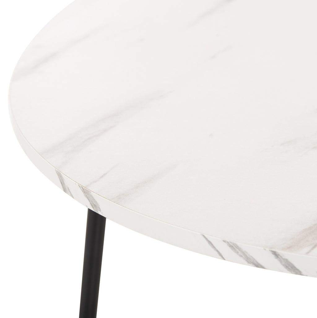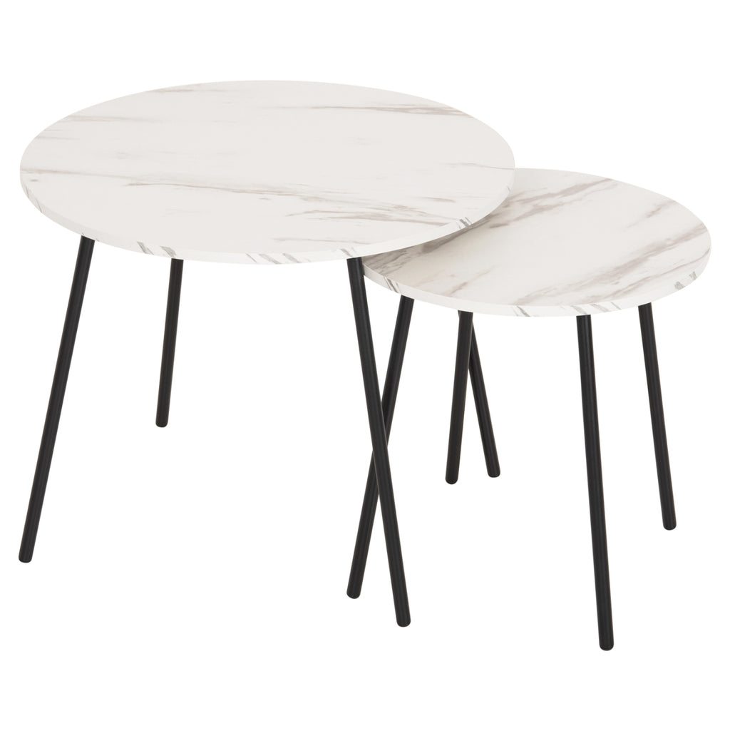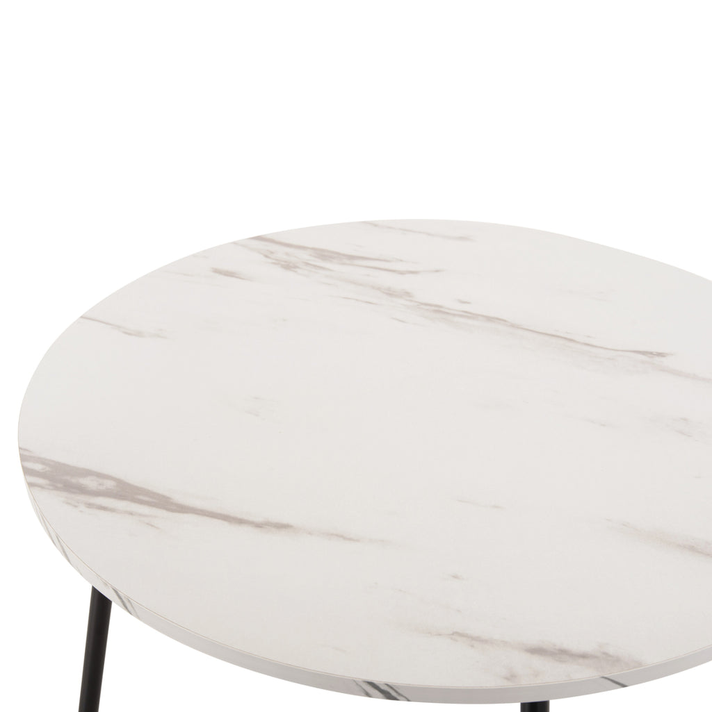 Помощни маси CUPPER ще ви зарадват със своя стил и практичност. Можете да създадете оригинални декоративни композиции, давайки нов живот на вашето пространство с този комплект. Това са 2 кръгли маси, една по-висока и една по-къса, която се съхранява под високата. Краката са метални в черен цвят, а повърхностите им са в цвят БЯЛ МРАМОР. РАЗМЕРИ: Височина: Φ55x45H см. Къс: Φ40x40H см. Размери на метала: Φ16 mm Дебелина на меламин: 15 mm МАТЕРИАЛ ЗА ИЗРАБОТКА: Плотовете са изработени от висококачествен меламин с дебелина 15 mm. Меламинът е вид дървесина под формата на ПДЧ (панел). Като материал е много издръжлив и с голяма твърдост. Така че това е синтетичен материал с много твърда повърхност, което го прави много устойчив на драскотини, абразия и петна. Краката и основите на масите са изработени от метал с електростатично боядисване. Електростатичното боядисване е процес на сухо покритие, използван като метално покритие. Електростатичното боядисване е нанасяне на сух прах чрез електростатичен процес, който след това се „свързва“ към метала чрез топлина. Известен е с високо качество на облицовките както по отношение на функционалност, така и на цялостен външен вид. ПОДДРЪЖКА: Както повърхността, така и краката се почистват лесно с влажна кърпа. ПРЕДИМСТВА: •Здрава конструкция •Качествени материали и методи на изработка •Естетически красиви маси •Практични за използване •Не заемат много място, тъй като едната влиза под друга •Имат защитни пластмаси на краката за защита на пода **Точното цветопредаване на продукта може леко да се различава от действителния продукт поради различните настройки на всеки монитор. ***Продуктът не е разглобен и се нуждае от сглобяване.