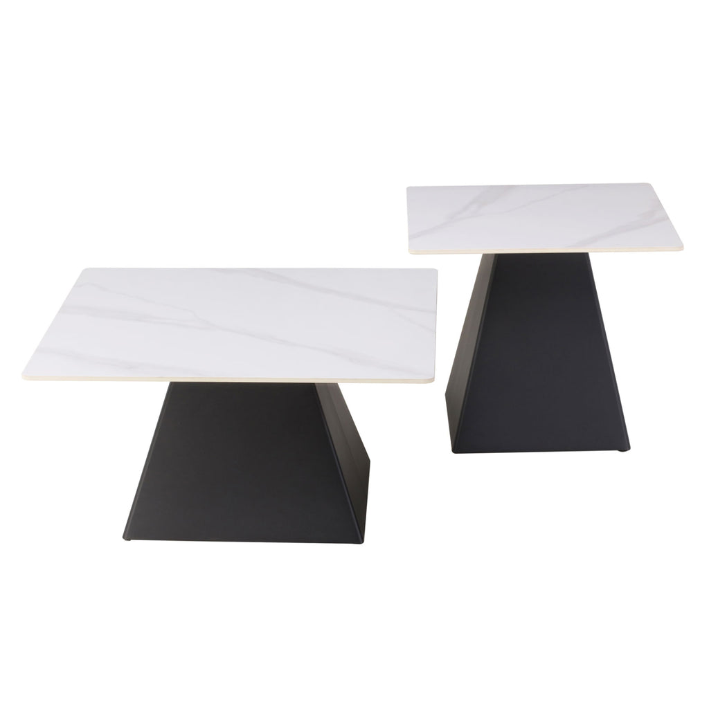Комплектът от 2 маси QUBER за хола ще бъде чудесно допълнение към вашето пространство. Това са 2 квадратни метални маси с различни размери с ЧЕРНИ пирамидални основи. Повърхностите са от гладка керамика с БЯЛ мраморен вид. Идеални както за дома, така и за професионални пространства.