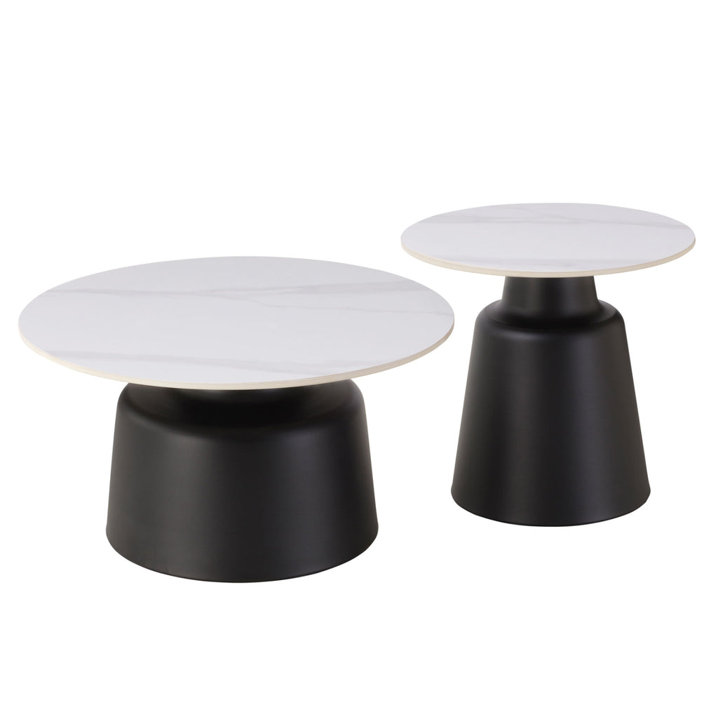 Комплектът от 2 маси RINKON за хола е поредното ново допълнение към нашата гама. Това са 2 кръгли метални маси с различни размери. Едната има конична основа, която завършва с красива "шийка", а другата има почти цилиндрична основа. И двете са в ЧЕРЕН цвят. Повърхностите са гладки керамични с БЯЛ мраморен вид. Идеални както за дома, така и за професионални пространства. РАЗМЕРИ: Висока: Φ50x47H см.—БЯЛА МРАМОРНА ОБЛИЦОВКА Ниска: Φ70x37H см.—БЯЛА МРАМОРНА ОБЛИЦОВКА Дебелина на керамичната повърхност: 1,2 см. МАТЕРИАЛИ ЗА СТРОИТЕЛСТВО: -Основите са изработени от метал с електростатична боя, която придава перфектен завършек и издръжливост. - Повърхностите са керамични. Керамичните материали са a) Устойчиви на надраскване: Керамиката има твърда повърхност, която е устойчива на надрасквания и вдлъбнатини. b) Устойчиви на топлина: Едно от уникалните свойства на керамичните маси е естествената им устойчивост на топлина. c) Лесни за почистване: Непорестата природа на керамиката прави почистването изключително лесно. ПОДДРЪЖКА: Керамичната повърхност може да се мие с неутрални или дезинфекциращи почистващи препарати, разредени в топла вода, следвайки инструкциите за употреба, и след това да се изплакне с чиста вода и мека кърпа. Избягвайте използването на химически почистващи препарати. *Комплектът се доставя несглобен във фабрична опаковка. ** Цветопредаването на продукта може леко да се различава от фотографското му представяне на вашия екран.