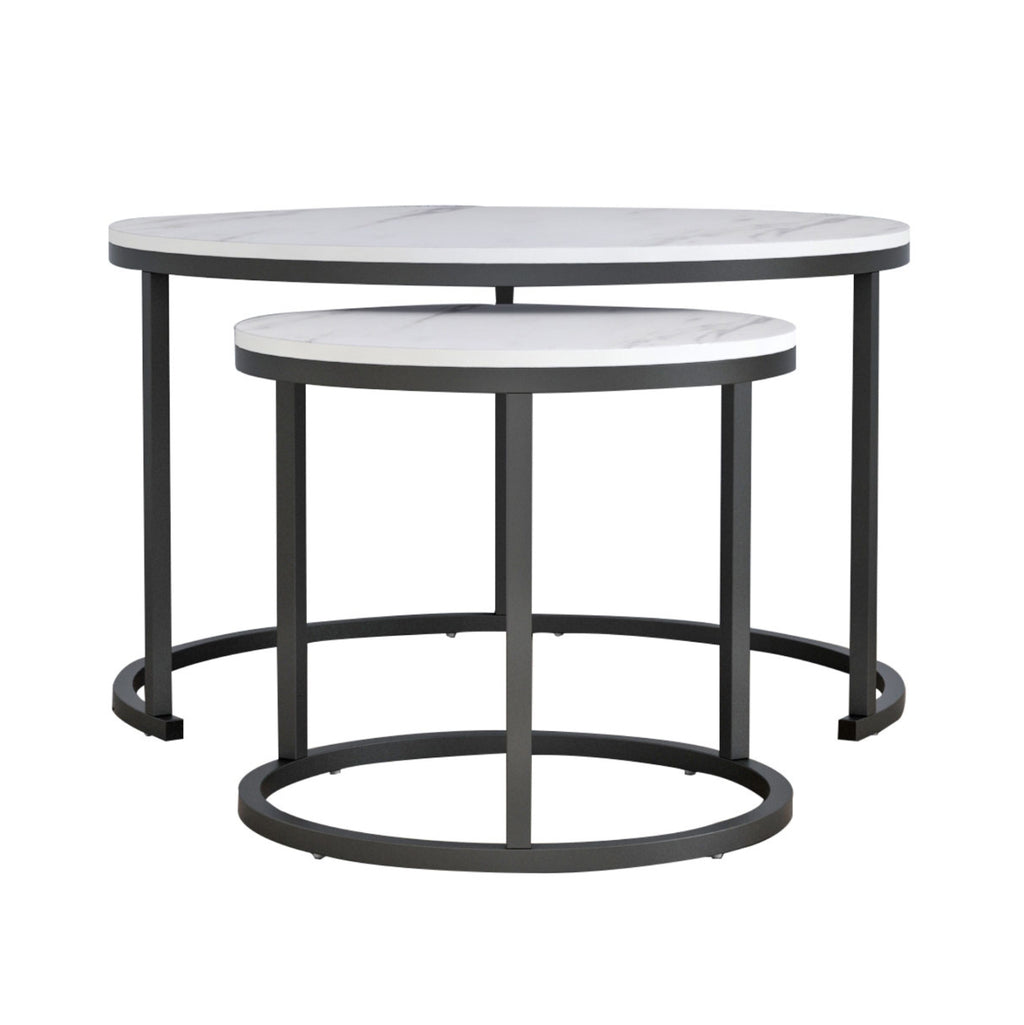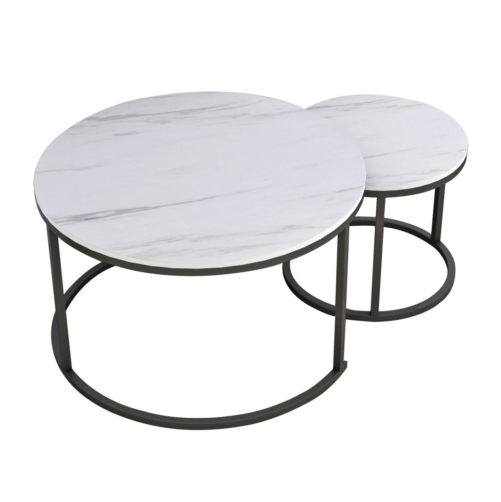 Холни маси КГ8763.12----- Холните маси КГ8763.12 ще ви зарадват със своя стил и практичност. Това са 2 холни маси, една по-висока и една по-къса, с особеност, че по-високата се опира на полукръгла основа с три метални крака, което позволява по-късата да се побира и съхранява директно отдолу. Основите и на двете маси са метални в черен цвят, а повърхностите им са в имитация на бял мрамор от МДФ.