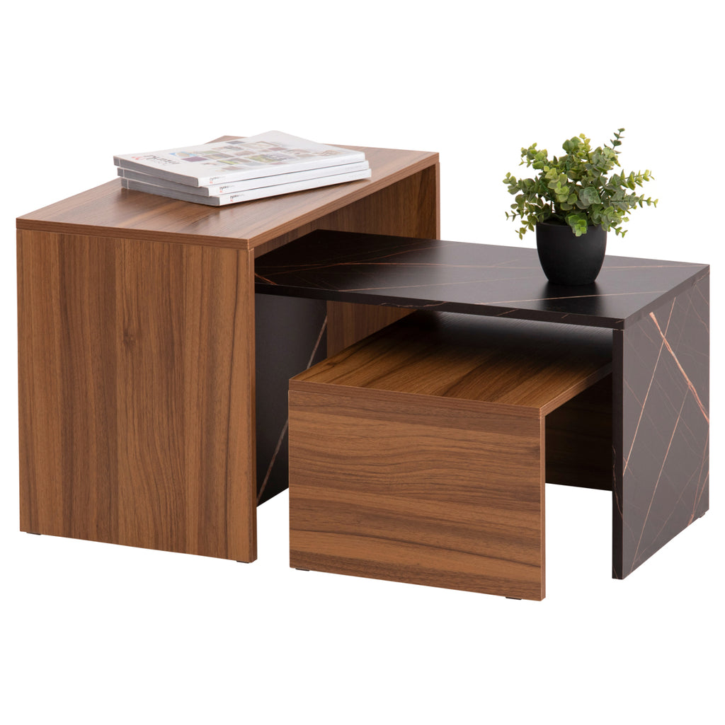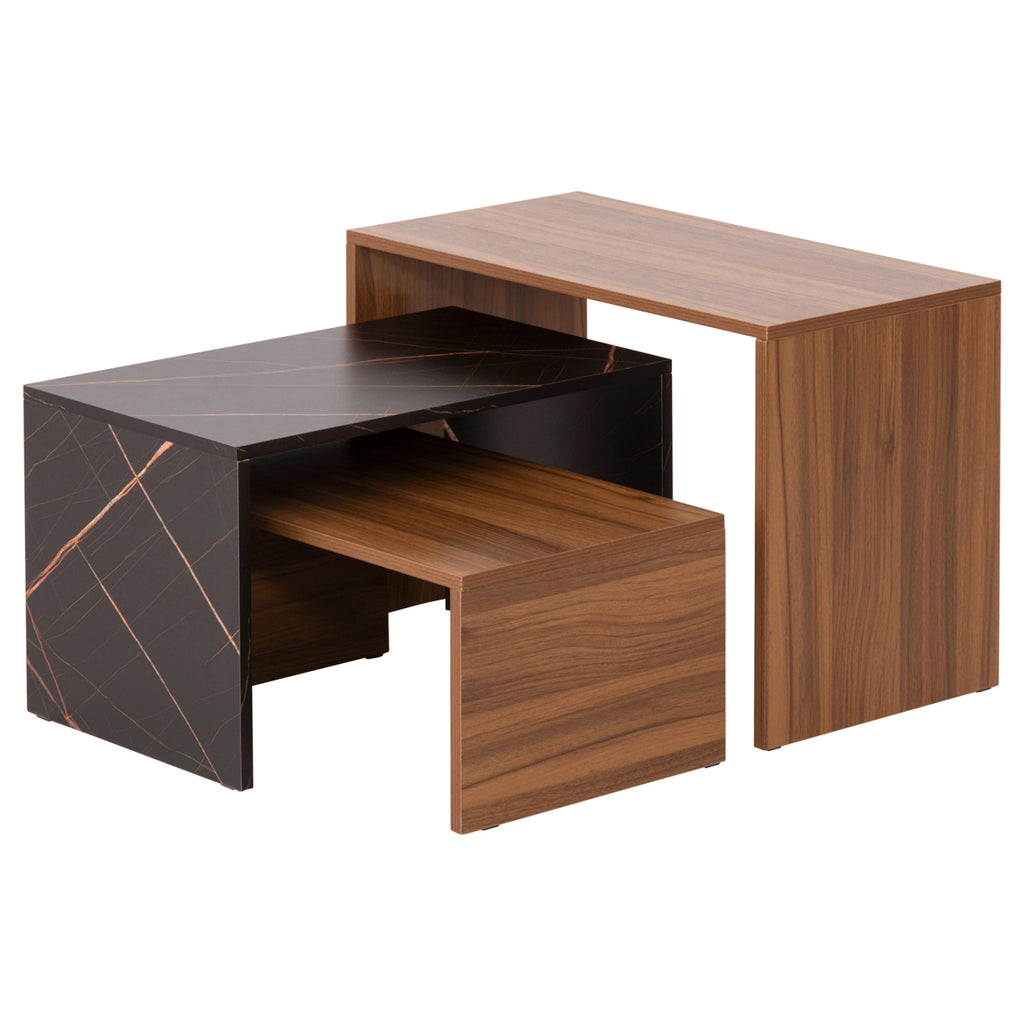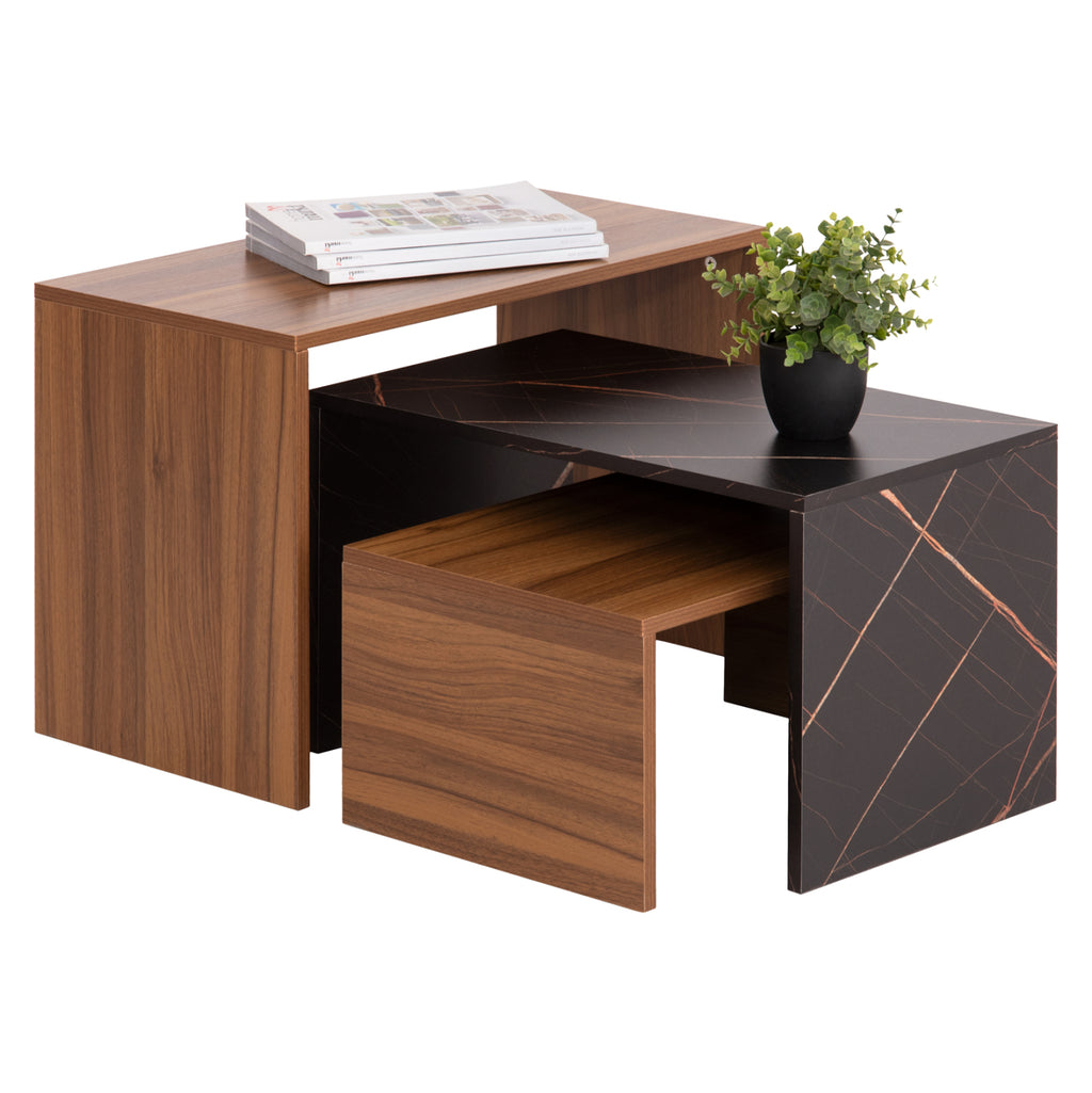 Със страничните маси BENTIL можете да създадете оригинални декоративни композиции, давайки нов живот на вашето пространство. Това са 3 меламинови холни маси, 2 в цвят ОРЕХ и една в цвят ЧЕРЕН МРАМОР. Удивителният елемент на този комплект е, че настройката и разположението им създават впечатлението за една масичка за кафе. РАЗМЕРИ: Големи размери: 65х35х45см. Средни размери: 59x35x36см. Малки размери: 53x35x26см. МАТЕРИАЛИ НА ИЗРАБОТКАТА: Масите са изработени от 15мм меламин. Меламинът е вид дървесина под формата на ПДЧ (панел). Като материал е много издръжлив и с голяма твърдост. Така че това е синтетичен материал с много твърда повърхност, което го прави много устойчив на драскотини, абразия и петна. ПОДДРЪЖКА: Масите се почистват лесно с влажна кърпа. ПРЕДИМСТВА: •Стабилна конструкция •Качествени материали •Естетически прекрасни маси •Практични за използване •Не заемат много място *Продуктът се доставя разглобен във фабрична опаковка ** Цветопредаването на продукта може леко да се различава от фотографското му представяне на вашия екран.