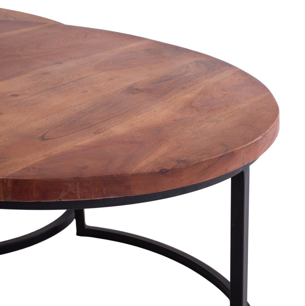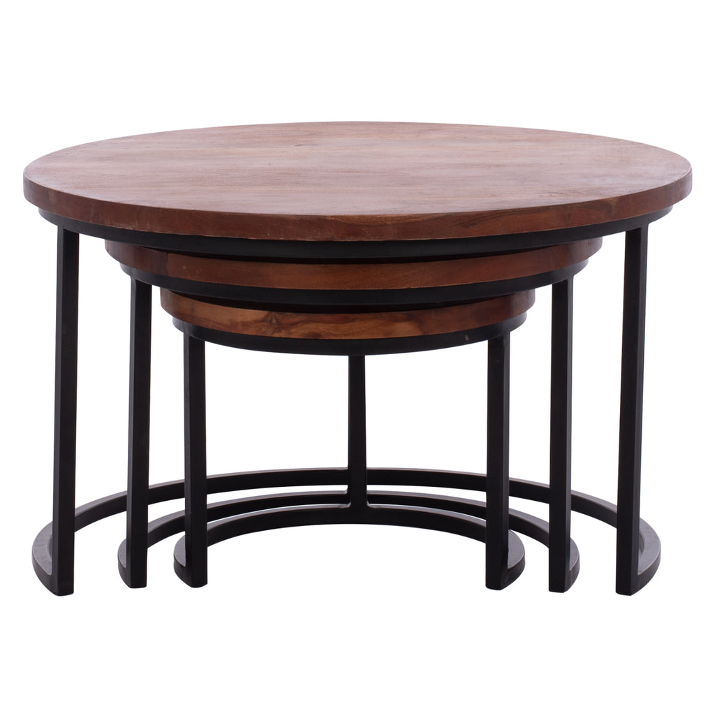 Σετ ΖΙΓΚΟΝ που αποτελείται από 3 τραπέζια σε ολοστρόγγυλο σχήμα με 3 μαύρα μεταλλικά πόδια σε διάταξη ημικυκλικής βάσης. Οι γωνίες των τραπεζιών είναι στρογγυλεμένες και το κόψιμό στις άκρες είναι κανονικό. Το αισθητικό αποτέλεσμα είναι όμορφο και είναι αναπόφευκτο να τραβήξει την προσοχή όλων, σε οποιοδήποτε χώρο κι αν τοποθετηθούν! *Οι υπάρχουσες ρωγμές ή ελαφρές χρωματικές αποκλίσεις, ή αυτές που ενδέχεται να δημιουργηθούν με την πάροδο του χρόνου οφείλονται στην συστολή-διαστολή του ζωντανού οργανισμού που λέγεται μασίφ ξύλο, και δεν αποτελούν κατασκευαστικό ελάττωμα, δίνοντας πρωτοτυπία και μοναδικό design στο χώρο σας. Αυτά δεν αποτελούν ελάττωμα του προϊόντος. ΤΕΧΝΙΚΑ ΧΑΡΑΚΤΗΡΙΣΤΙΚΑ: Διαστάσεις: Μεγάλο τραπέζι: Φ78x47 εκ. Μεσαίο τραπέζι: Φ58x38,5 εκ. Μικρό τραπέζι: Φ43x34,5 εκ. Πάχος ξύλινης επιφάνειας: 3 εκ. ΥΛΙΚΟ ΚΑΤΑΣΚΕΥΗΣ:Τα τραπέζια είναι κατασκευασμένα από μασίφ ξύλο ακακίας σε καρυδί απόχρωση. Το μασίφ συνιστά ένα είδος ξύλου, καθαρό και ατόφιο, που παραδοσιακά χρησιμοποιούν οι μαραγκοί για την κατασκευή επίπλων. Το μασίφ είναι η πιο ακριβή επιλογή σε είδος ξύλου αλλά ξεχωρίζει για την διαχρονική αισθητική του. Το αποτέλεσμα που προσφέρει στον κάτοχό του είναι πραγματικά μοναδικό. Το ξύλο της ακακίας, τώρα, είναι από τα καλύτερα είδη ξύλου που κυκλοφορούν στην αγορά. Η μηχανική του αντοχή και οι μηχανικές του ιδιότητες προσεγγίζουν αυτές άλλων γνωστών ξύλων, όπως η οξιά, ο δρυς, η afzelia, το teak και άλλα. Το ξύλο ακακίας είναι υψηλής βιολογικής αντοχής, δηλαδή παρουσιάζει εξαιρετική αντοχή στην δράση μικροοργανισμών που θα μπορούσαν να καταστρέψουν το υλικό και τις κατασκευές. Τα πόδια των τραπεζιών είναι κατασκευασμένα από μέταλλο και η αντοχή τους στο βάρος είναι τεράστια. Στο κάτω μέρος διαθέτουν πλαστικές τάπες για την προστασία των πατωμάτων σας. ΣΥΝΤΗΡΗΣΗ: Σε εσωτερικό χώρο, τα τραπέζια δεν χρειάζονται ιδιαίτερη συντήρηση. Ένα πέρασμα με υγρό πανί είναι αρκετό, και εάν υπάρχουν λεκέδες με ένα απαλό spray από τα πολλά που κυκλοφορούν στην αγορά. Γενικά, ακόμα και σε περίπτωση λεκέδων το μυστικό είναι το γρήγορο καθάρισμα πριν προλάβει το ξύλο να «ποτίσει». Εάν τα τραπέζια τα χρησιμοποιείτε σε εξωτερικό χώρο, καλό θα ήταν τον χειμώνα να τα προστατεύσετε με κάποιο κάλυμμα για να μην είναι εκτεθειμένα στα στοιχεία της φύσης. ΠΛΕΟΝΕΚΤКГΑΤΑ: Τα τραπέζια ακακίας μπορούν να χρησιμοποιηθούν κυρίως σε εσωτερικό χώρο. Είναι εύκολα στην συντήρησή τους και η μεγάλη βιολογική τους αντοχή τα καθιστούν ιδανική επιλογή για πληθώρα χρήσεων και χώρων. Ο αισθητικός τους αντίκτυπος αιχμαλωτίζει τα βλέμματα όλων!
