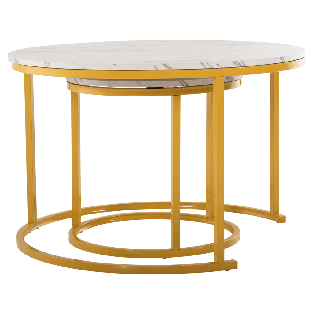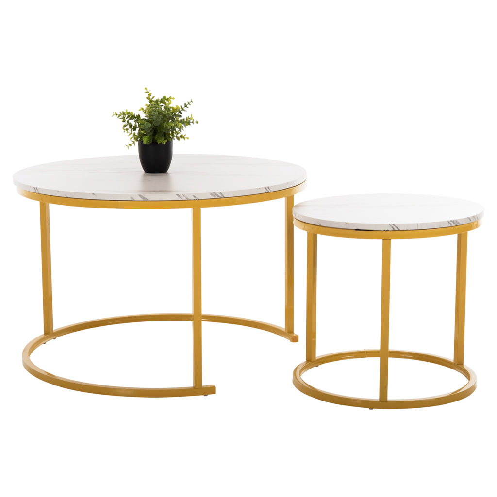 Холни маси ΜΜ8763.11----- Холните маси ΜΜ8763.11 ще ви зарадват със своя стил и практичност. Това са 2 холни маси, една по-висока и една по-къса, с особеност, че по-високата лежи върху полукръгла основа с три метални крака, което позволява по-късата да се побира и съхранява директно отдолу. Основите и на двете маси са метални в цвят злато, а повърхностите им са имитация на бял мрамор от MDF. РАЗМЕРИ: Височина: Φ80x52H см. Къс: Φ48x46H см. Размери на метала: 20х20мм Дебелина на МДФ: 15мм МАТЕРИАЛИ НА ИЗРАБОТКА: Повърхностите на масите са изработени от висококачествен МДФ с меламиново покритие. МДФ (влакна със средна плътност) е модерен потребителски материал, който много често се избира за интериорни мебели. Основните му характеристики са, че абсорбира минимална влага, има хомогенност в масата си, задоволителни механични свойства, отлична гладкост и много възможности за обработка. Краката и основите на масите са изработени от метал със златно електростатично боядисване. Електростатичното боядисване е процес на сухо покритие, използван като метално покритие предимно върху промишлено оборудване. Електростатичното боядисване е нанасяне на сух прах чрез електростатичен процес, който след това се „свързва“ към метала чрез топлина. Известен е с високо качество на облицовките както по отношение на функционалност, така и на цялостен външен вид. Електростатичните покрития са не само издръжливи, но и гъвкави. Може да се използва върху различни повърхности като метал, бетон, стомана и пластмаса. Подходящ е както за вътрешни, така и за външни приложения и е един от най-икономичните варианти за боядисване. ПОДДРЪЖКА: Както повърхността, така и краката се почистват лесно с влажна кърпа. ПРЕДИМСТВА: •Здрава конструкция •Качествени материали и начин на изработка •Естетически красиви маси •Практични за ползване •Не заемат много място, тъй като влизат една под друга