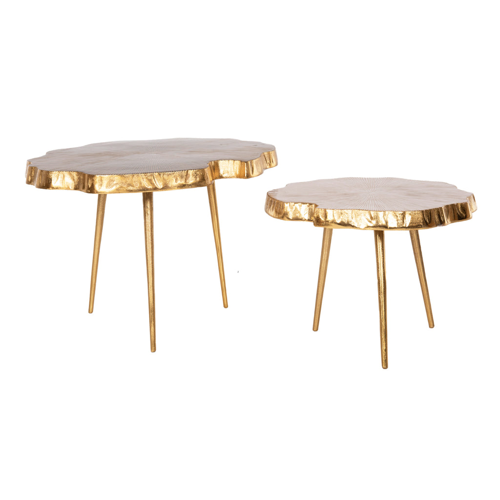 Комплект маса ANGUL е комплект от 2 холни маси, изработени изцяло от метал. Най-големият в ЗЛАТНО и ЧЕРНО, а най-малкият в ЗЛАТНО-БЯЛО. Особеността на тези маси е, че те симулират "парче" от ствол на дърво и следователно формата на повърхността им е неправилна. Този комплект ще придаде напълно различен образ на вашето пространство. РАЗМЕРИ: Голям: 62x62x44H см. Височина на крака: 39 см. Разстояние между краката: 34см. Малък: 48x40x35H cm. Височина на крака: 30,5см. Разстояние между краката: 29см. ПОДДРЪЖКА: Необходимо е само почистване от прах и при необходимост почистване с влажна кърпа. *Комплектът се доставя разглобен във фабрична опаковка ** Цветопредаването на продукта може леко да се различава от фотографското му представяне на вашия екран.