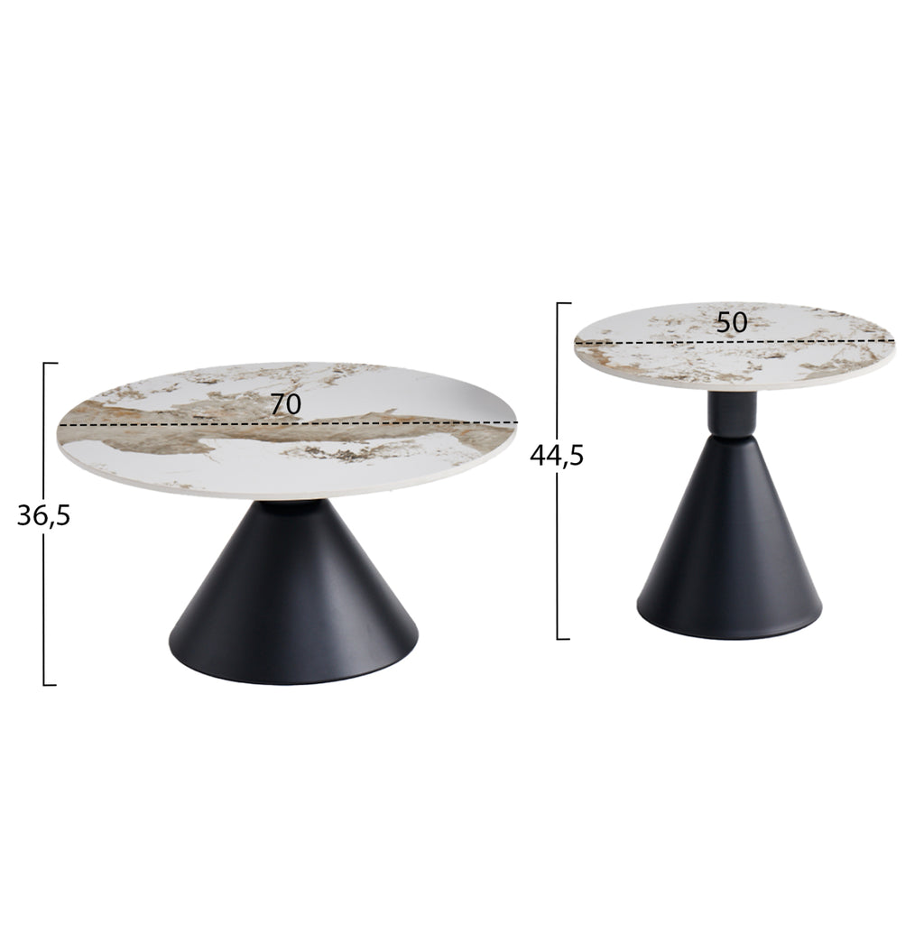 Този комплект маси за хол се състои от 2 кръгли метални маси с различни размери. Основите им са конусовидни в ЧЕРЕН цвят, а повърхностите са изработени от лъскав синтерован камък в цветова схема на Пандора. Идеални както за дома, така и за професионални пространства. РАЗМЕРИ: Високи: Φ50x44.5H см. Ниски: Φ70x36H см. Дебелина на синтерования камък: 12 мм СТРОИТЕЛНИ МАТЕРИАЛИ: -Метал с електростатично боядисване, което придава перфектен завършек и издръжливост. - Повърхностите са изработени от синтерован камък (синтерован камък). Разбира се, това няма нищо общо с камъка, тъй като това е неговият научен термин. Синтерованият камък е матрица (калъп) от минерали, като гранит, кварц, парчета стъкло и др., които се нагряват (слепват), за да образуват твърда, непропусклива маса, която води до повърхност, която не може да бъде ецвана, надраскана, изгорена или оцветена. Всъщност, дори по свойствата си, този материал е много подобен на керамиката, но е дори по-добър! ПОДДРЪЖКА: Избършете с мека и леко влажна кърпа. Избягвайте употребата на химически почистващи препарати. *Комплектът се доставя несглобен във фабрична опаковка. ** Цветопредаването на продукта може леко да се различава от фотографското му представяне на вашия екран.