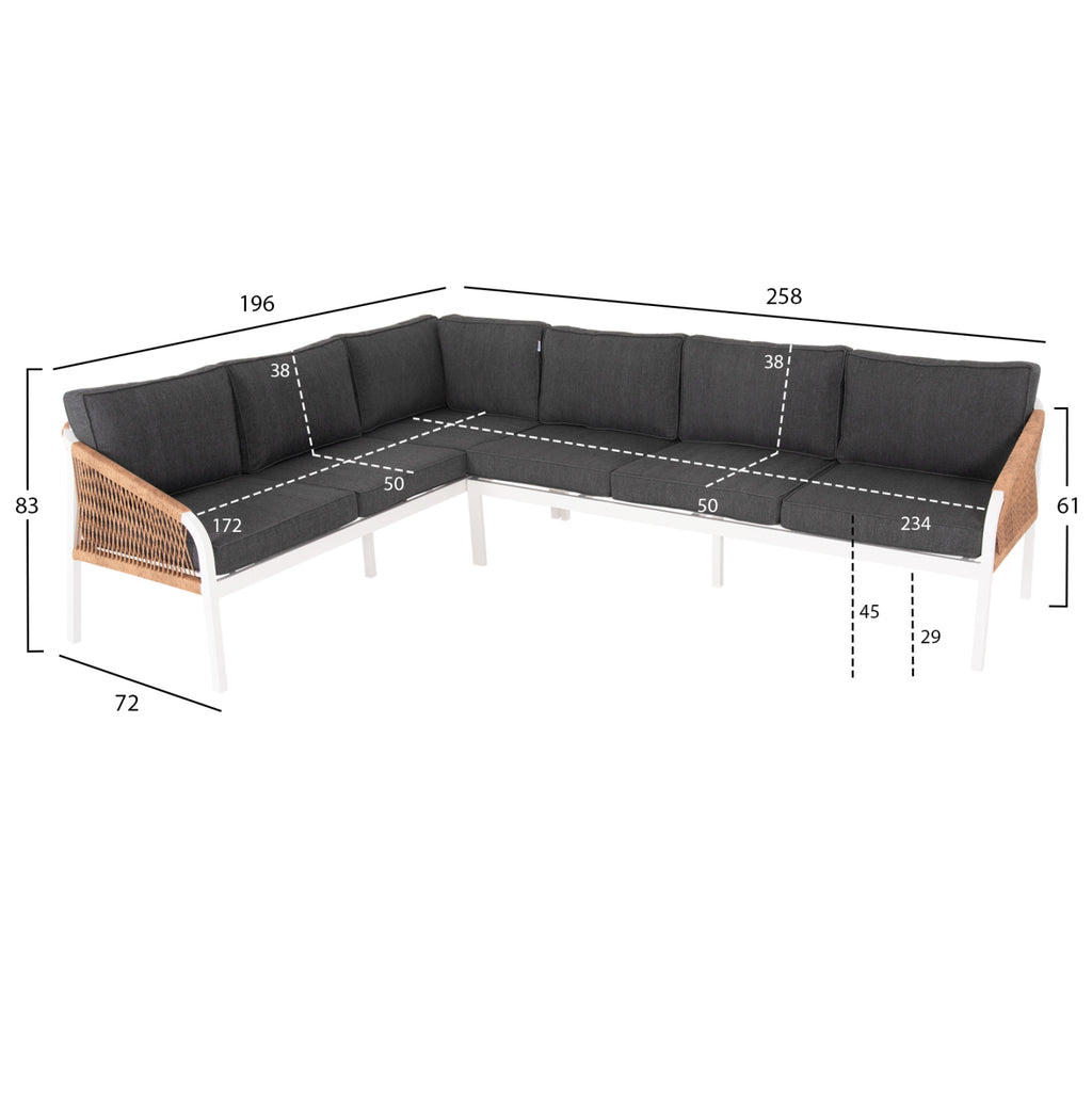 Представяме ви ефектната и нова външна ъглова всекидневна MAERLY в БЯЛ цвят, с холна маса и 2 дивана. Комплект, който ще обикнете от пръв поглед. Рамката на диваните е алуминиева с БЕЖОВО синтетично въже на подлакътниците. Холната маса е с повърхност полидървесина в НАТУРАЛЕН дървесен цвят. Възглавниците в целия комплект са покрити с полиестерен плат в цвят CARBON и са с пълнеж от дунапрени със средна твърдост за максимално удобство, както и с ципове. Какво повече може да поиска някой, за да обнови външното си пространство? РАЗМЕРИ: ДИВАН 72-258x72-196x74-83Yсм. Размери на седалката: 50-234x50-172 см. Размери на гърба: 234-38х172-38см. Височина на ръцете: 61 см. Височина на седалката: 45 см. Височина на крака: 29 см. Разстояние между краката: 256x190 см. МАСА МАСА Размери: 120x56.5x40.5Y см. Разстояние между краката: 115х50 см. Спецификации на алуминия: Φ25xT1.5mm Спецификации на синтетичното въже: Φ21mm КОНСТРУКТИВЕН МАТЕРИАЛ: Целият комплект е изработен от алуминий с електростатично боядисване. Алуминият е метал с отлични механични свойства и много устойчив на различни форми на корозия по природа и изисква минимални разходи за поддръжка. Електростатичното боядисване е процес на сухо покритие, използван като метално покритие чрез електростатичен процес. Подходящ е както за вътрешни, така и за външни приложения. Полидървесината на плота на масата е материал, изработен изцяло от HDPE (полиетилен с висока плътност), т.е. вид пластмаса, която е особено издръжлива и водоустойчива, която е обработена, за да изглежда като дърво. ПОДДРЪЖКА: Идеалното за поддръжка на алуминий е използването на много мека кърпа или гъба, обилно количество вода и мек почистващ продукт, като например препарат за миене на съдове. Алуминиевите мебели нямат специални изисквания за поддръжка, тъй като не корозират. **Точното цветопредаване на продукта може леко да се различава от действителния продукт поради различни настройки на монитора.