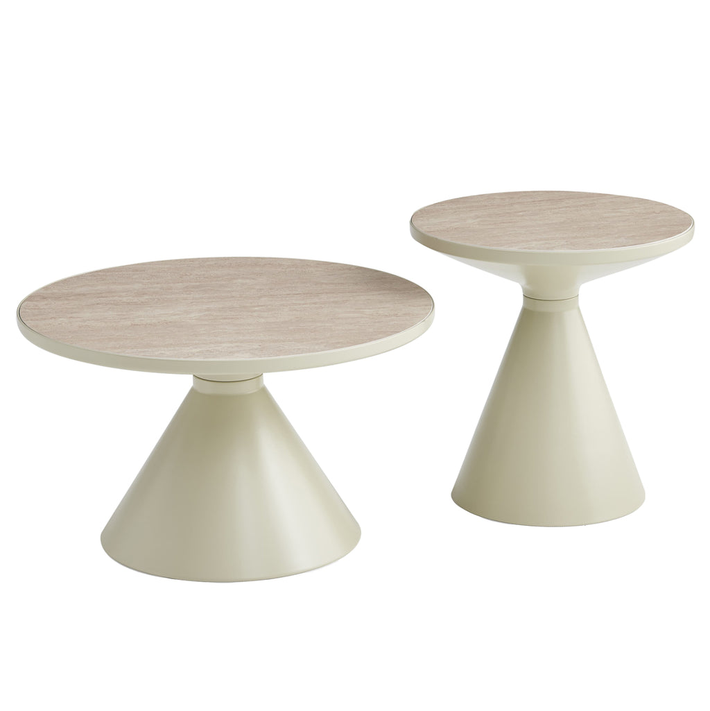 Комплектът масички за кафе LYNX от SYMETRON се състои от 2 кръгли метални масички с различни размери. Основите им са конусовидни в цвят ШАМПАНСКО, а плотовете на масите са изработени от синтерован камък с вид на ТРАВЕРТИН. Идеални както за дома, така и за професионални пространства.