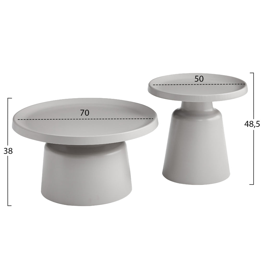 Този комплект от 2 маси за хола е красив и много практичен. Това са 2 изцяло метални кръгли маси с различни размери в СИВ цвят. Едната е с конична основа, която завършва с красива "шийка", а другата е с почти цилиндрична основа. Идеални както за дома, така и за професионални пространства. РАЗМЕРИ: Висок: Φ50x48.5H см. Нисък: Φ70x38H см. МАТЕРИАЛИ ЗА ИЗРАБОТКА: Метал с електростатична боя, която придава перфектен завършек и издръжливост. ПОДДРЪЖКА: Избърсвайте с мека кърпа. Избягвайте използването на химически почистващи препарати. ** Цветопредаването на продукта може леко да се различава от фотографското му представяне на вашия екран.