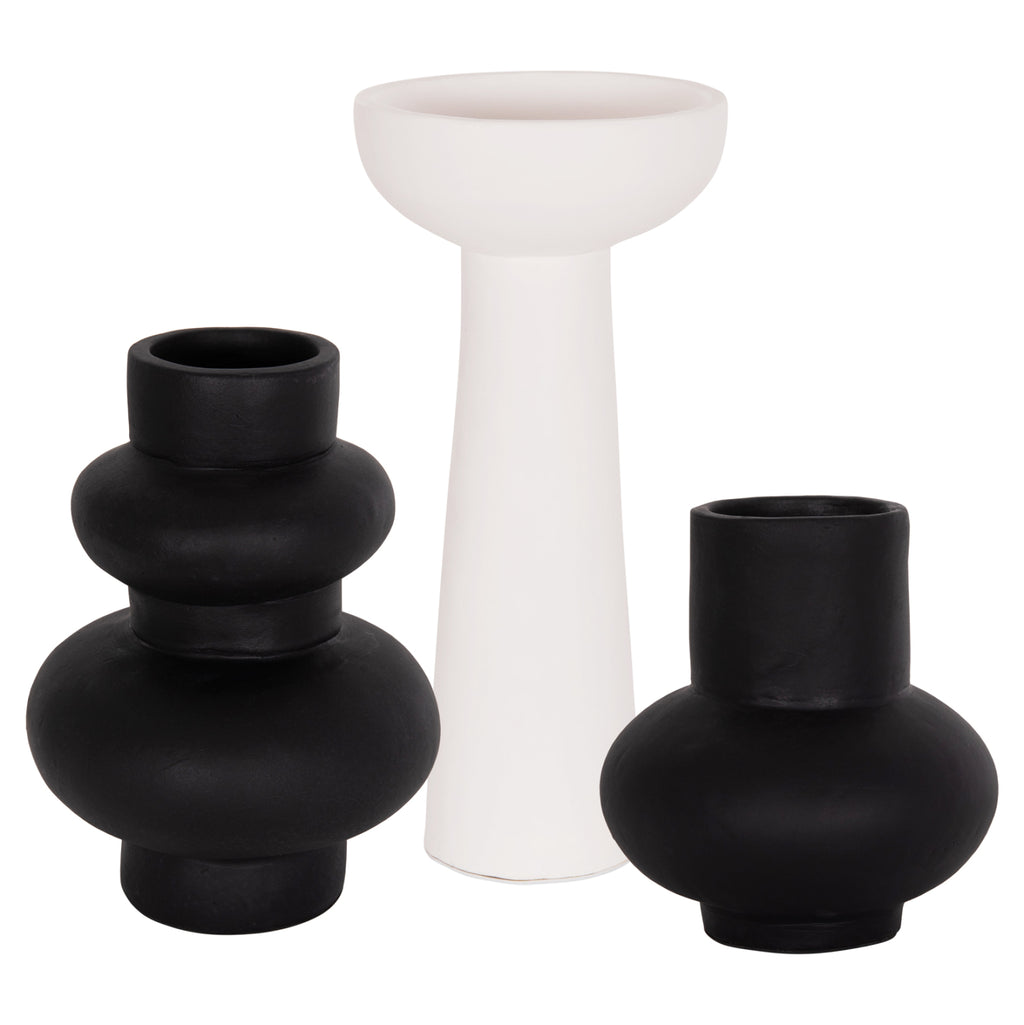 Комплект от 3 декоративни настолни вази в различни цветове и форми. Изработени са изцяло от теракота в БЯЛ и ЧЕРЕН цвят (1 бяло-2 черни). Идеален за различни пространства, както за дома, така и за професионални пространства. *САМО ЗА УПОТРЕБА НА ЗАКРИТО* РАЗМЕРИ: ВИСОЧИНА: Φ18x38см.--Отвор: Φ4 см. (бял) СРЕДЕН: Φ22x29см.--Отвор: Φ8см. (черно) КЪСО: Φ22x22см.--Отвор: Φ9 см. (черен) МАТЕРИАЛИ ЗА ИЗРАБОТКА: Материалът за изработка е теракот. Теракотата е керамичен материал. Името му идва от латински и означава "видима почва" (terra = почва, пръст и cotta = видима, изпечена). Затова, когато казваме, че нещо е направено от теракот, имаме предвид, че е направено от глина. ПОДДРЪЖКА: Едно почистване с прах обикновено е достатъчно, но избягвайте използването на химически почистващи препарати. ** Цветопредаването на продукта може леко да се различава от неговото фотографско представяне на вашия екран.