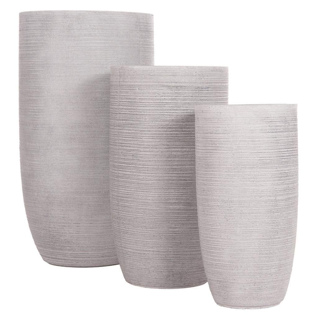 Представяме ви серията GARDENER, която включва комплекти саксии, изработени от FiberClay и е най-новото попълнение в нашата гама. Този комплект се състои от 3 цилиндрични саксии с различни размери в цвят цимент. Идеален за външни пространства. РАЗМЕРИ: Малък: Φ26.5x51H см. Среден: Φ34x61.5H cm. Голям: Φ42x78H cm. СТРОИТЕЛНИ МАТЕРИАЛИ: FiberClay е общ термин, който описва материал, който съчетава влакна, смола и минерали. Полученият продукт обикновено се използва за създаване на саксии и градински контейнери. ПОДДРЪЖКА: Достатъчна е суха кърпа или гъба и малко сапун и вода. При външните саксии е важно да пробиете дупки на дъното, за да може да се оттича излишната вода, но и за да се предотврати счупването на съда при замръзване. ПРЕДИМСТВА: --Саксиите от FiberClay са леки и устойчиви на ултравиолетови лъчи, което е голям плюс. Саксия от бетон или естествен камък е изключително тежка. Така че фактът, че FiberClay е лек материал, е особено важен за балконски и покривни градини. -- Методът на изработка създава много мощна есенция. Това означава, че саксиите от FiberClay са здрави и устойчиви на атмосферни влияния. **Точното цветопредаване на продукта може леко да се различава от действителния продукт поради различни настройки на монитора.
