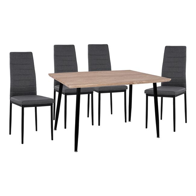 КОМПЛЕКТЪТ ВКЛЮЧВА Атрактивна модерна маса с черна метална основа и мдф повърхност сонама. Размери: 120х70х76.5см. Падане на повърхността: 3,5 см. Четири кухненски стола изработени от метална конструкция в черен цвят и тапицирани с дамаска в сиво. Размери: 40х48х95см. Височина на седалката: 47 см. Размери на седалката: 40х40 см.