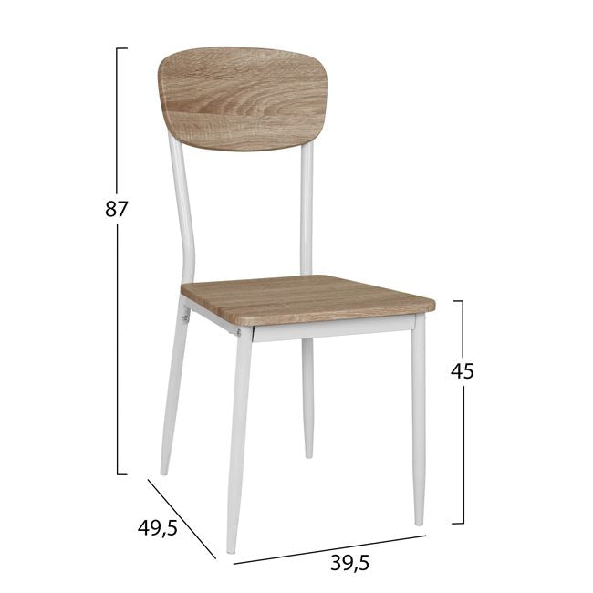 КОМПЛЕКТЪТ ВКЛЮЧВА Атрактивна модерна маса с бяла метална основа и мдф повърхност сонама. Размери: 110x70x76H см. Дебелина на повърхността: 1,5 см. Четири трапезни стола изработени с уникална комбинация от метал и мдф. Рамката на стола е метална, а седалката и облегалката са изработени от МДФ в цвят сонама. Размери: 47х50,5х93 см. Височина на седалката: 47 см. Размери на седалката: 45х40 см.