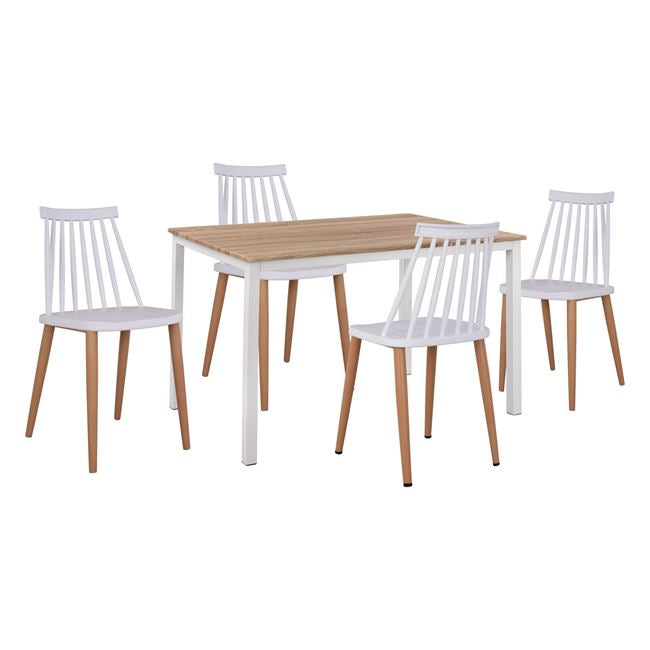 КОМПЛЕКТЪТ ВКЛЮЧВА Атрактивна модерна маса с бяла метална основа и мдф повърхност сонама. Размери: 110x70x76H см. Дебелина на повърхността: 1,5 см. Четири стола с бели полипропиленови седалки и метални крака с ефект на естествено дърво. Размери: 43х46,5х82см. Височина на седалката: 48см. Размери на седалката: 38х37 см.