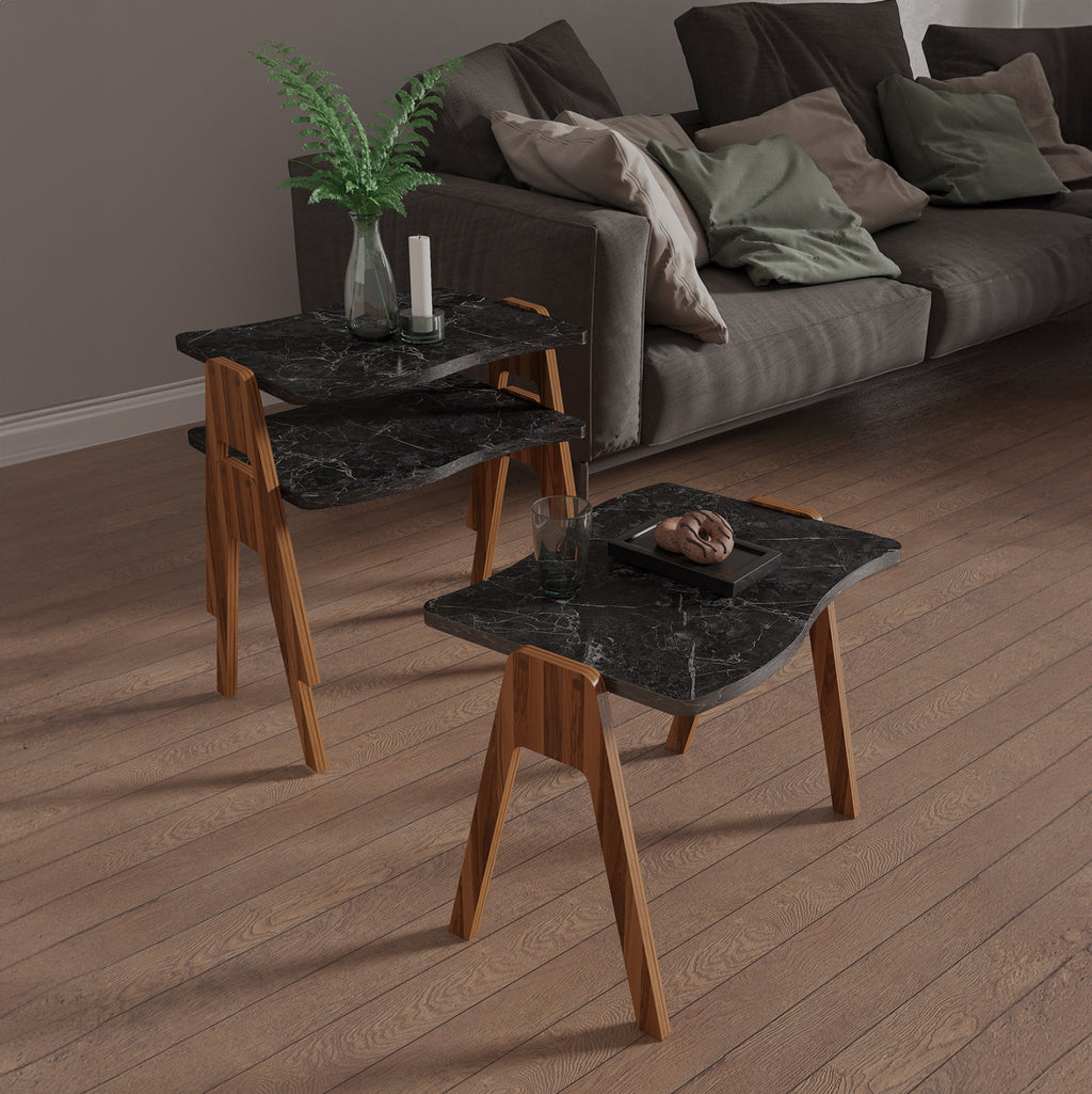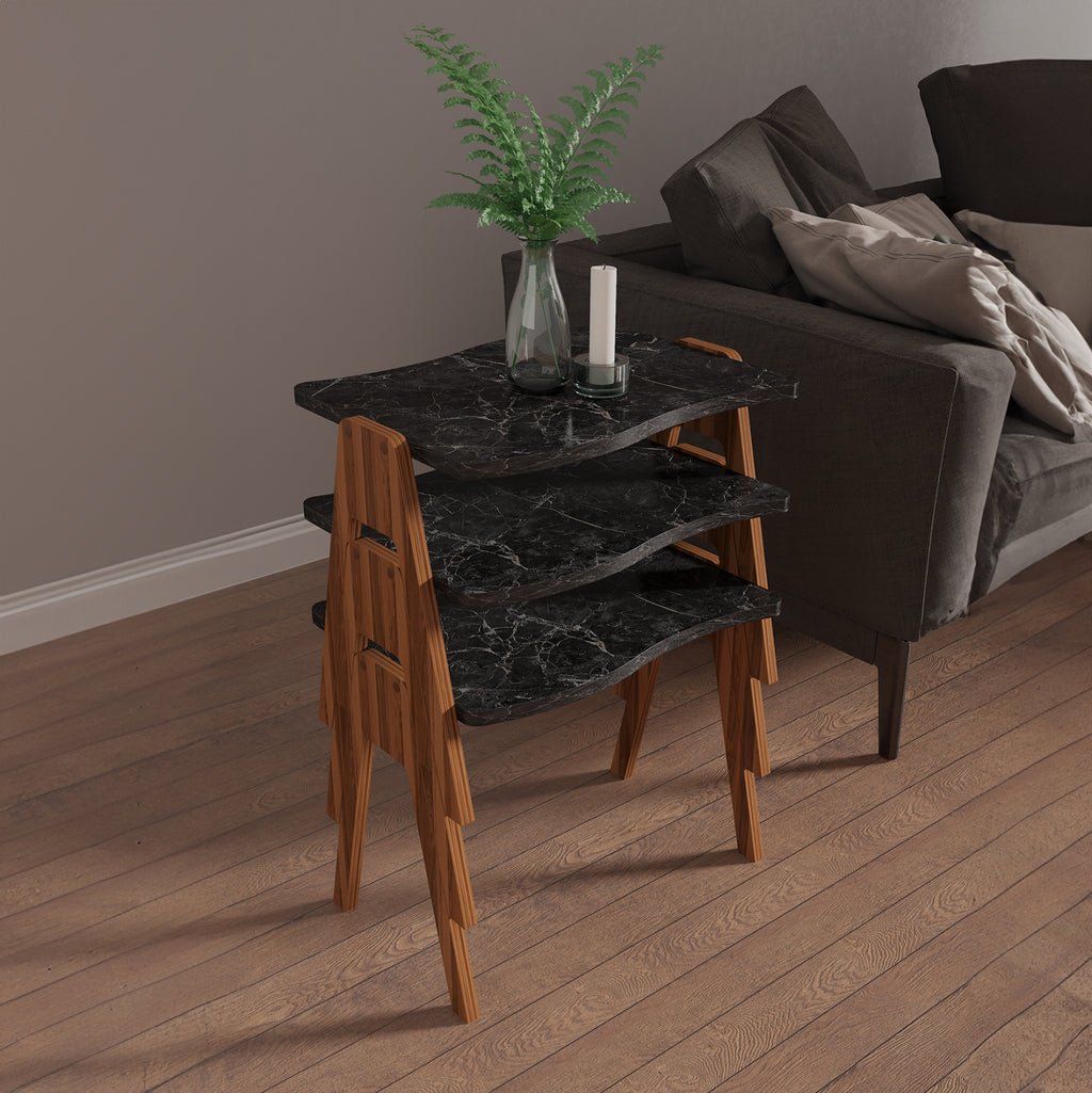 Холни маси ESSENT ще ви зарадват със своя стил и практичност. Придайте на пространството си нов облик с тези 3 18 мм меламинови маси за кафе в цветова комбинация ОРЕХ с извити повърхности в ИЗГЛЕД НА ЧЕРЕН МРАМОР, поставени една под друга. РАЗМЕРИ: 45х35х40см. МАТЕРИАЛИ ЗА ПРОИЗВОДСТВО: Меламинът е вид дървесина под формата на ПДЧ (плоч). Като материал е много издръжлив и с голяма твърдост. Така че това е синтетичен материал с много твърда повърхност, което го прави много устойчив на драскотини, абразия и петна. ПОДДРЪЖКА: Както повърхността, така и краката се почистват лесно с влажна кърпа. КАКВО НИ ХАРЕСВА: •Здрава конструкция •Естетически страхотни маси •Практични за използване •Не заемат много място, тъй като едната влиза под другата *Продуктът се доставя във фабрична опаковка ** Цветопредаването на продукта може леко да се различава от фотографското му представяне на вашия екран.