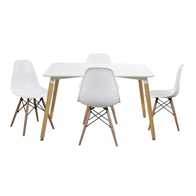 КОМПЛЕКТЪТ ВКЛЮЧВА Атрактивна модерна маса в бяло, тя е невероятно решение за всеки минималистичен дом. Комбинацията от бяло с масивни букови крака го прави страхотна идея за вашата кухня. Изработен от полипропилен в сатенена текстура. Размери: 120x80 H.73 см. Четири полипропиленови стола в матирана текстура и бял цвят. Краката на стола са изработени от масивно дърво. Столът се предлага в комплект. Размери: 47x53x81 см Височина от седалката до земята 45 см
