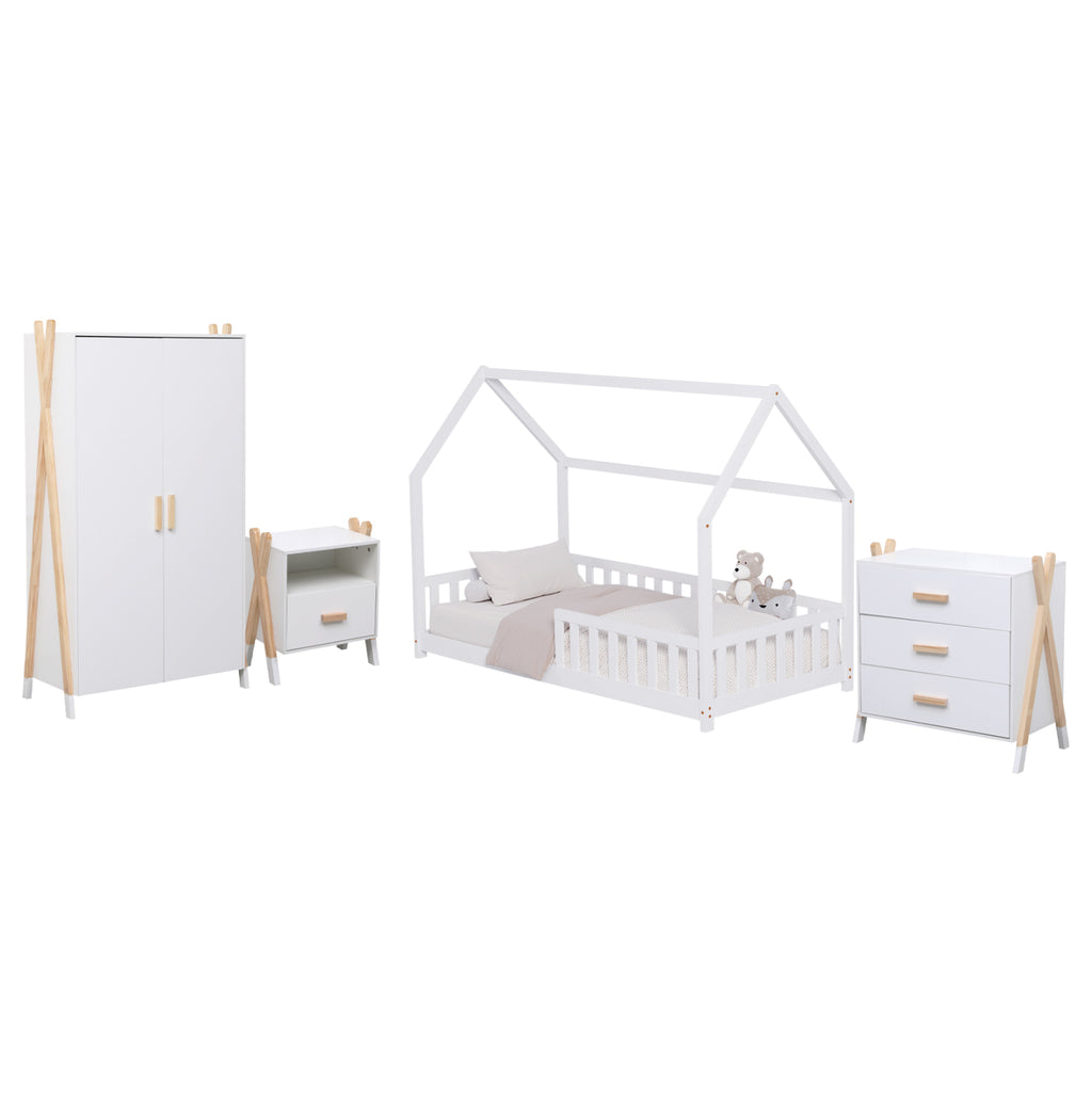 Комплект за детска стая PASCHAL включва нощно шкафче, легло в стил Монтесори с решетки, гардероб и скрин! Детайли: КГ2488.03- Детско меламиново нощно шкафче в БЯЛ цвят с рамка от борова дървесина в кръстосана подредба. Размери: 46х30х55см. Чекмедже: 37x24x15.8см.-----Рафт: 37x26.5x16см. КГ679.03- Детско легло във формата на къща в стил Монтесори, с парапет---БОР в БЯЛ цвят. Размери: 196х97х141Н см.----за матрак 190х90см. Височина на релсата: 27 см.---Разстояние между релсите: 6,5 см. ΜΜ2494.03- Детски меламинов гардероб в БЯЛ цвят с рамка от чамова дървесина в кръстосано разположение. Размери: 96x44x170H см. Размери на рафтовете: 86,5x40,5x27H см.-----Височина на окачване: 81,5см. КГ2493.03: Детски скрин с 3 чекмеджета. Меламин в БЯЛ цвят с рамка от борова дървесина в подреждане на кръст. Размери: 76x40x80.5H см. Размери на чекмеджето: 61.5x28.7x12.5H cm. *Продуктите се доставят непокътнати във фабрична опаковка