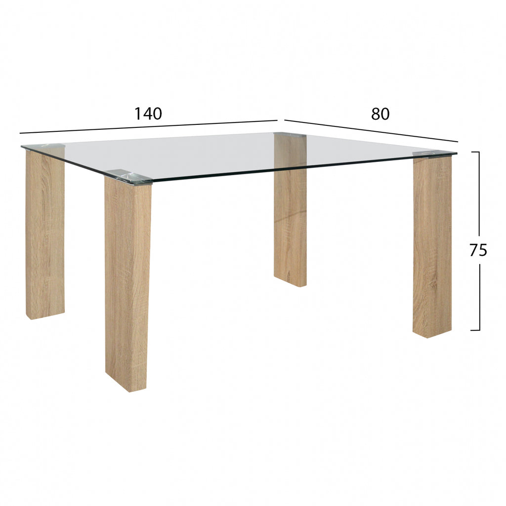 КОМПЛЕКТЪТ ВКЛЮЧВА Маса MORGAN, специален и модерен вариант, който да изберете за вашия дом. Комбинация от стъкло и дърво. Стъклото е безопасно 10мм, а краката са от мдф дърво. Цвят на стъклото: Прозрачен Цвят на дървото: Сонама Размери: 140х80х75 см. И 4 кресла LEAH от кадифена дамаска в нюанс кипарис. Краката са метални, боядисани, за да придадат вид на дърво. Размери: 51х58х80 см. Височина на седалката: 48см.