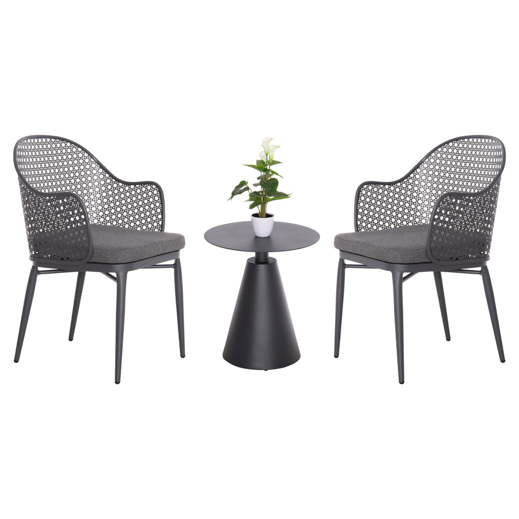 OREGO е външен алуминиев лаундж комплект от 3 части, състоящ се от 2 фотьойла и кръгла маса, всички в ТЪМНО СИВ цвят. В подобен нюанс са и седалките на фотьойлите. РАЗМЕРИ: Маса: Φ50x56H см. Основа: Φ35 см. Фотьойли: 58x55x83Y см. Дебелина на възглавницата: 5см. изработен от полиестерен материал Алуминий Спецификации: Φ32x1.2mm—Φ19x1.2mm ПОДДРЪЖКА: Почиствайте лесно с влажна кърпа. **Точното цветопредаване на продукта може леко да се различава от действителния продукт поради различни настройки на монитора.