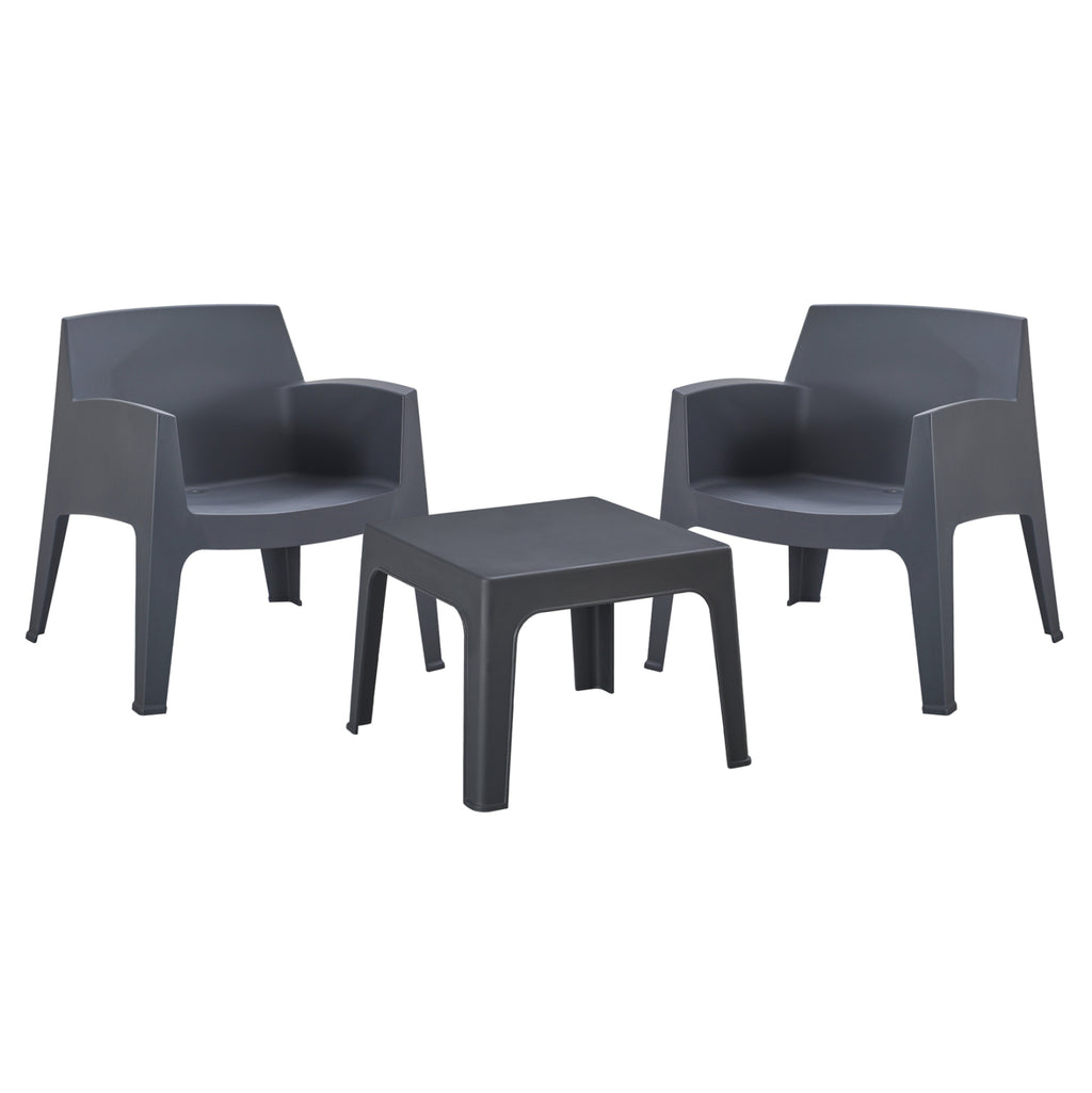 КОМПЛЕКТЪТ ЗА ЛОНДОН ВКЛЮЧВА: -2 фотьойла с ниска седалка, изработени от лят полипропилен, и -1 квадратна масичка за кафе, изработена от лят полипропилен, всички в СИВО. Комплектът е идеалното предложение за употреба на открито, независимо дали е професионална или за дома. РАЗМЕРИ: ФОТЬОЛИ: 62,5x48,5x73В см. Височина на седалката: 38 см. МАСА: 49,5x49,5x40В см МАТЕРИАЛ НА ИЗРАБОТКАТА: -100% висококачествен полипропилен. Полипропиленът е особено устойчив на тегло и вода, като същевременно има отлична устойчивост на топлина. Също така, неговата устойчивост не се ограничава до тегло, вода и температура, но е необичайно устойчив на много химически разтворители и киселини. ПОДДРЪЖКА: Мебелите от полипропилен се почистват лесно с влажна кърпа. Ако са на открито, могат да се почистват директно с течаща вода. ПРЕДИМСТВА: •Комфорт •Издръжливост •СТИРАЩИ СЕ фотьойли •Съотношение цена-качество ** Цветопредаването на продукта може леко да се различава от фотографското му представяне на вашия екран.