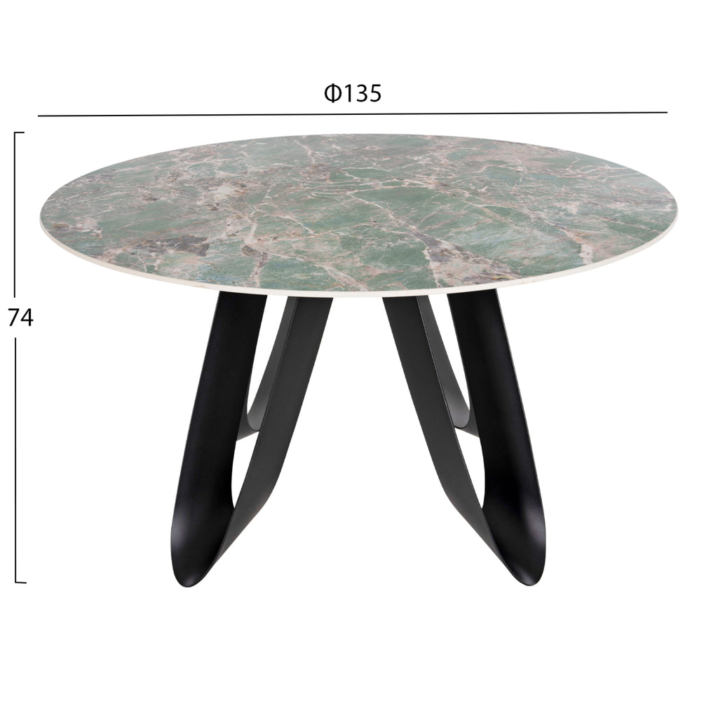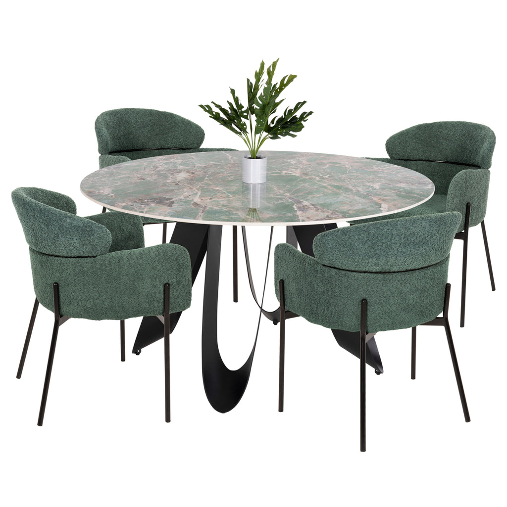 Този вътрешен трапезен комплект се състои от маса и 4 фотьойла. Масата е кръгла с гланцирана керамична повърхност в цвят МРАМОРНО СИВО, а красивите метални крака са в ЧЕРЕН цвят. Креслата са с дамаска букле в цвят БЕНЗИН. Този комплект ще придаде луксозен облик на всяка трапезария, независимо дали у дома или на бизнес място. РАЗМЕРИ: МАСА (КГ9852.03): Φ135x74H см. Дебелина на повърхността: 1,1 см. Разстояние между краката: 63-85 см. КРЕСЛА (КГ8583.03): 58x58x80H см. Размери на седалката: 46х48 см. Размери на гърба: 48х36см. Височина на седалката: 49 см. Височина на ръцете: 66 см. Разстояние на краката: 42-57x44 см. МАТЕРИАЛ НА ИЗРАБОТКА: Маса: Повърхността е керамична, а краката са метални. Кресла: Краката са метални, а тапицерията е от качествена дамаска букле. *Комплектът се доставя разглобен във фабрична опаковка ** Цветопредаването на комплекта може леко да се различава от фотографското представяне на вашия екран.
