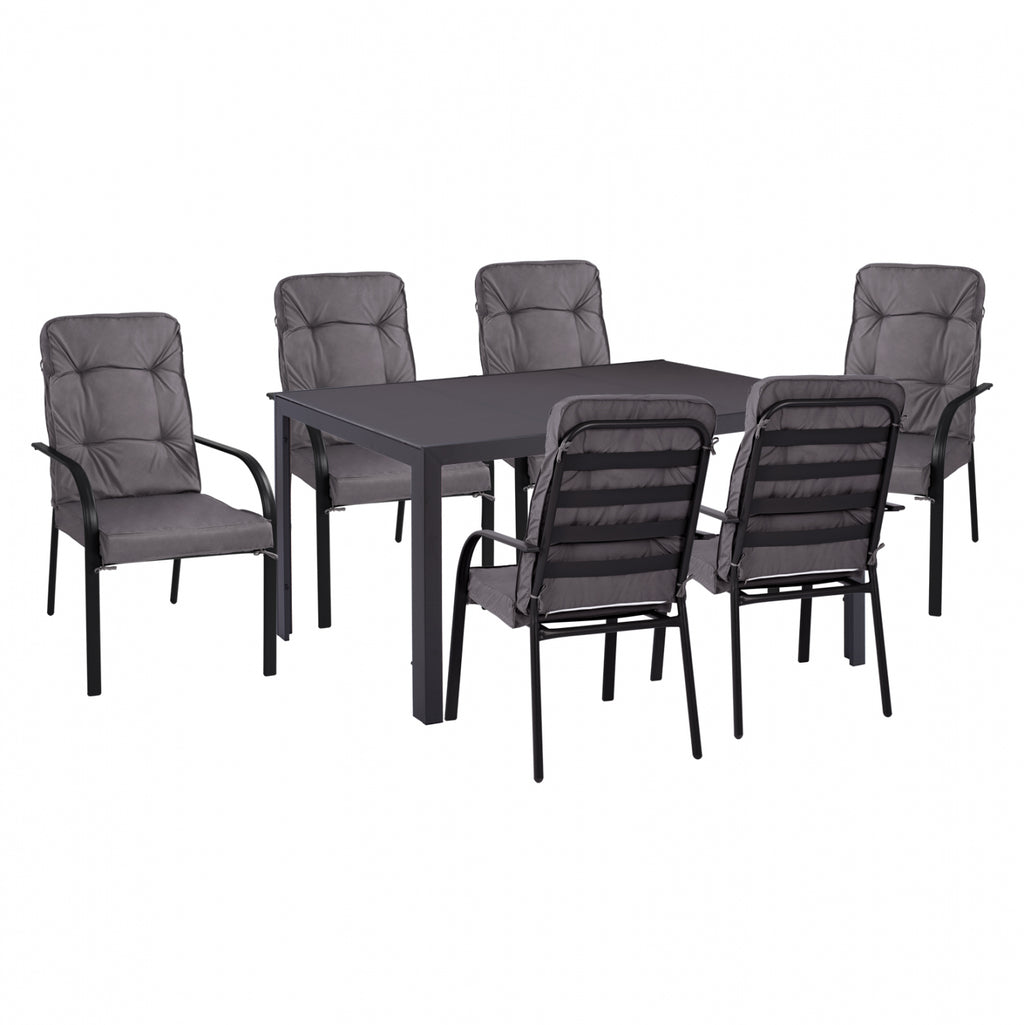 6-местен комплект за хранене. КОМПЛЕКТЪТ ВКЛЮЧВА Външна маса за хранене в сив нюанс със стъкло на повърхността. Той е издръжлив, тъй като е изработен от метал и това го прави подходящ както за вътрешна, така и за външна употреба. Размери: 150х90х75см. Шест модерни градински фотьойла, изработени от сив метал, с метални носещи ленти за възглавницата. Имат възглавница с цип с дебелина 8 см в сиво за облегалка и седалка. Размери: 60x71x105Y см. Височина на седалката: 49 см. Височина на ръцете: 63 см. Размери на седалката: 51х44 см. Дебелина на възглавницата: 8см. Идеален за бизнес помещения, но и за вашия дом, той ще ви даде комфорт и почивка.