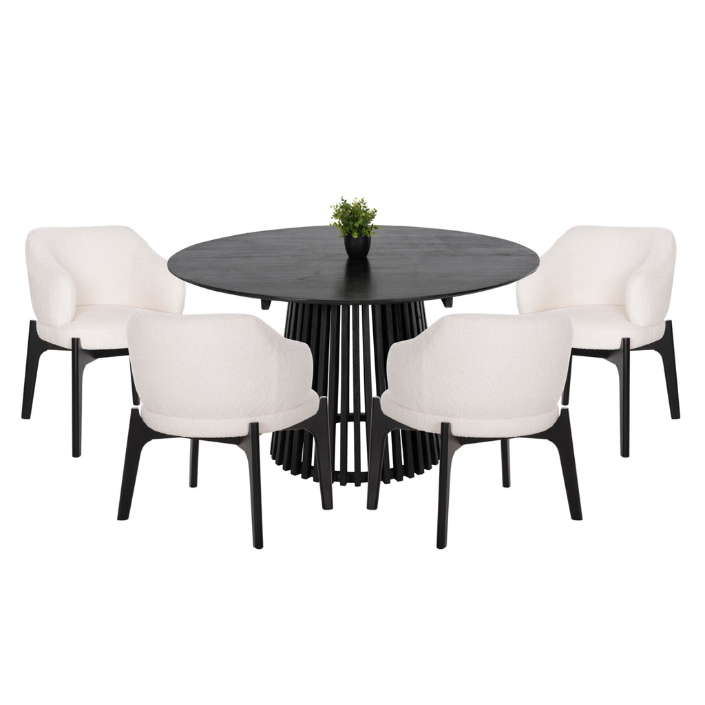 Този вътрешен трапезен комплект от 5 бр се състои от голяма кръгла маса FRANTZ, изработена изцяло от дърво MINDI в ЧЕРЕН цвят, и 4 трапезни стола ABAI, изработени от каучуково дърво в ЧЕРЕН цвят, с облегалка и седалка, тапицирани с БЯЛА дамаска от букле. РАЗМЕРИ: МАСА: Φ150x75Y см. Основа: Φ80 см. СТОЛОВЕ: 65x63x79H см. Размери на седалката: 44х47 см. Размери на гърба: 39х34см. Височина на ръцете: 70см. Височина на седалката: 49 см. Височина на крака: 39 см. Разстояние между краката: 65х50 см. МАТЕРИАЛИ НА КОНСТРУКЦИЯТА: Комплектът е изработен от естествено масивно дърво MINDI (маса) и каучуково дърво (столове). Седалката и облегалката на столовете са тапицирани с дамаска букле. **Съществуващите пукнатини или такива, които могат да се образуват с течение на времето се дължат на свиването-разширяването на живия организъм, наречен масивна дървесина, а не са производствен дефект, придавайки оригиналност и уникален дизайн на вашето пространство. По време на производствения процес съществуващите пукнатини се изглаждат и стабилизират с материал от същата дървесина. СЛЕДОВАТЕЛНО МОЖЕ ДА ИМА ЦВЕТОВИ ВАРИАЦИИ И РАЗЛИКИ В РАЗМЕРИТЕ НА ПРОДУКТА. Това не са дефект на продукта. *Масата се доставя разглобена ** Цветопредаването на продукта може леко да се различава от фотографското представяне на вашия екран.