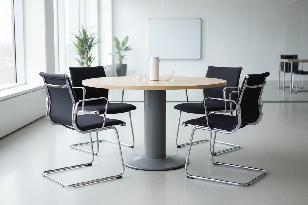 Професионално конферентно бюро с кръгла повърхност, изработено от здрав меламин в нюанс бук и метална основа в сив нюанс. Размери: Φ105х75см. Забележки: Продуктът се доставя в несглобен вид, във фабрична опаковка.