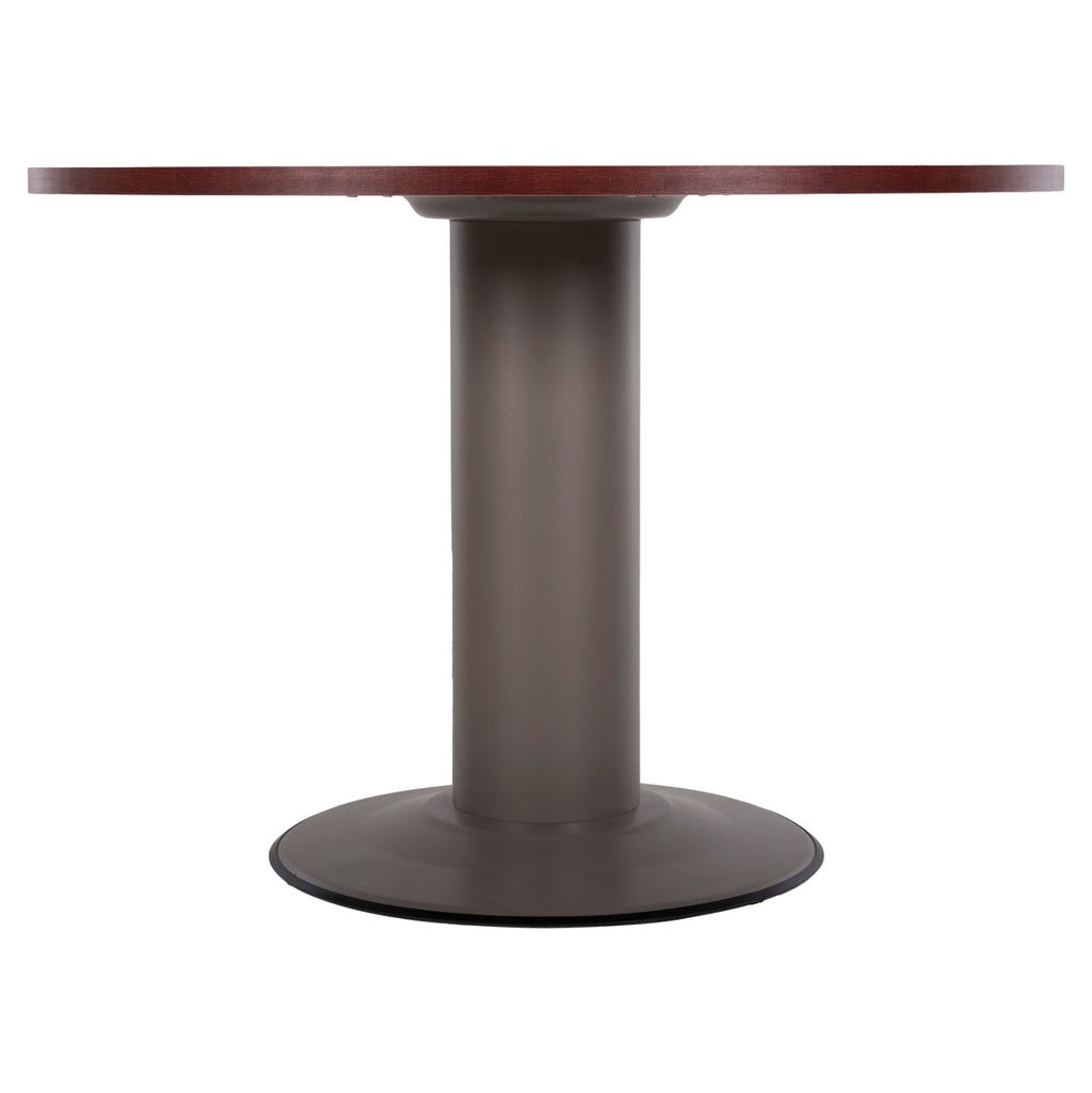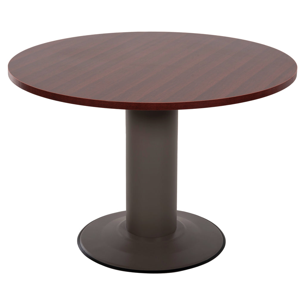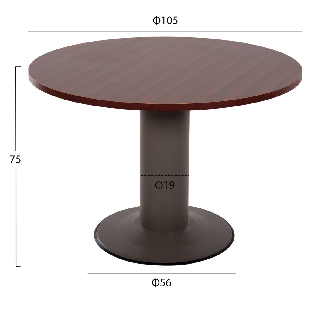 Професионално бюро за срещи с кръгла повърхност, изработено от здрав меламин в нюанс венге и метална основа в сив нюанс. Размери: Φ105х75см. Дебелина на повърхността: 2,5 см. Височина на крака: 70 см. Основа: Φ 56 см. Крак: Φ 19 см. Забележки: Продуктът се доставя в несглобен вид, във фабрична опаковка.