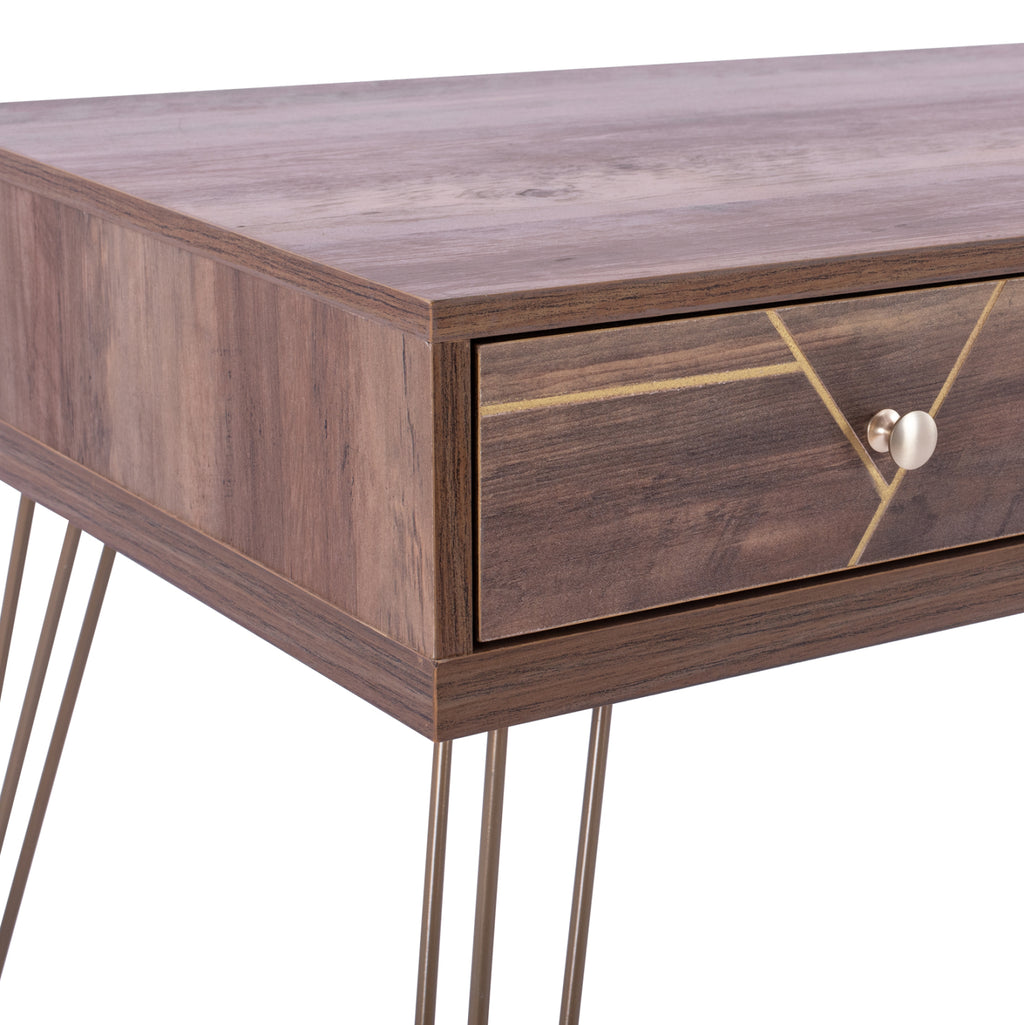 Конзола KAITLYN от меламин в цвят орех със златни детайли и златни метални крака. Има 3 чекмеджета за съхранение на вашите вещи. Тази мебел може лесно да украси трапезарията или всекидневната. Уникална мебел за уникален дом. Обновете вашето пространство, като придадете нотка на миналото, но с модерна естетика и приемете вечна мебел във вашето пространство, която ще впечатли и най-трудните хора. Размери: 120x55x79.5Y см. Размери на крака: 130х68 см.