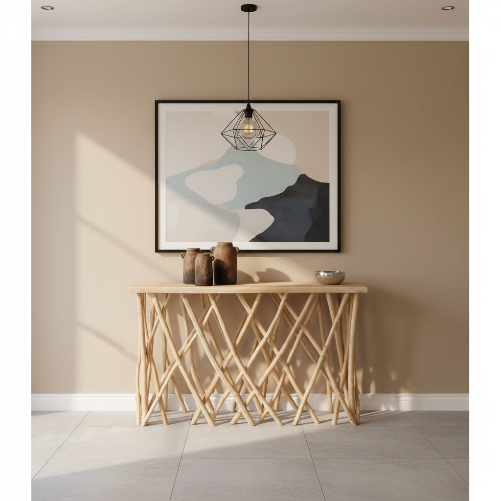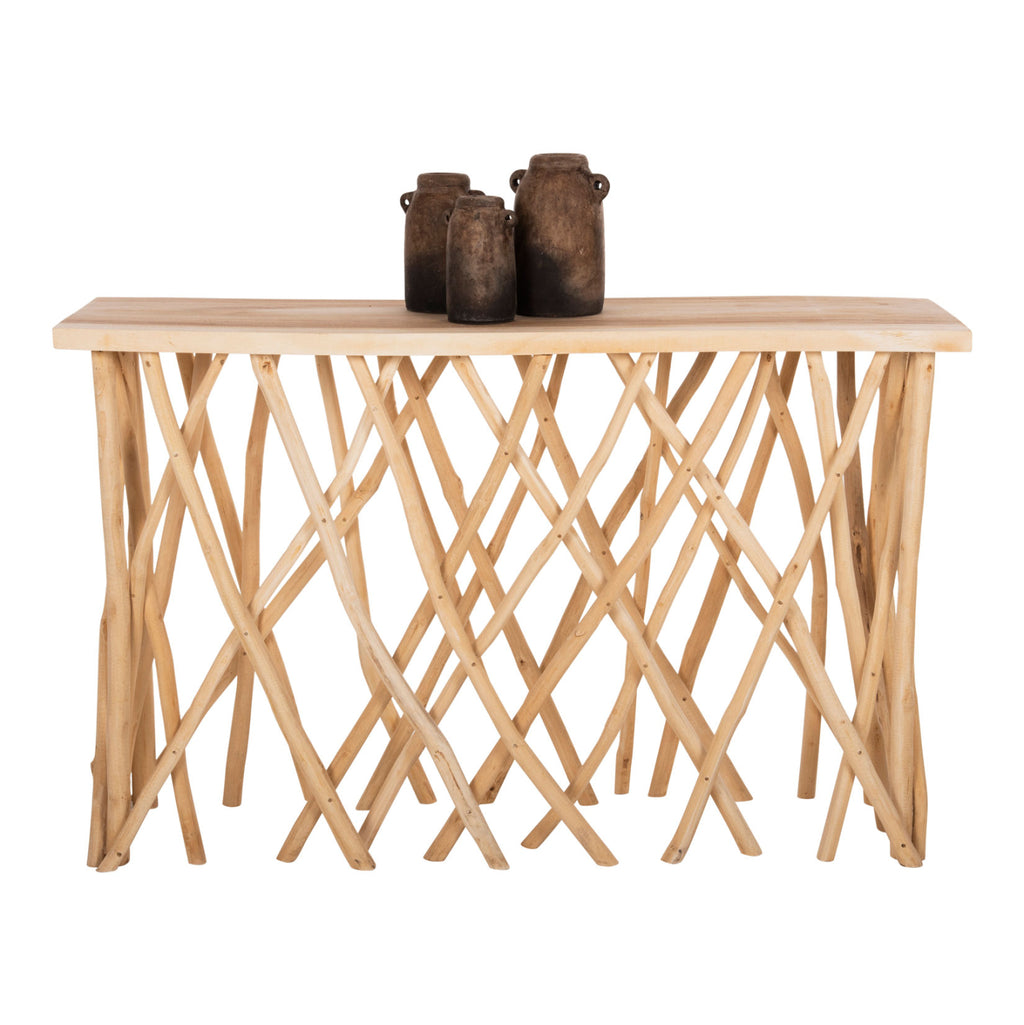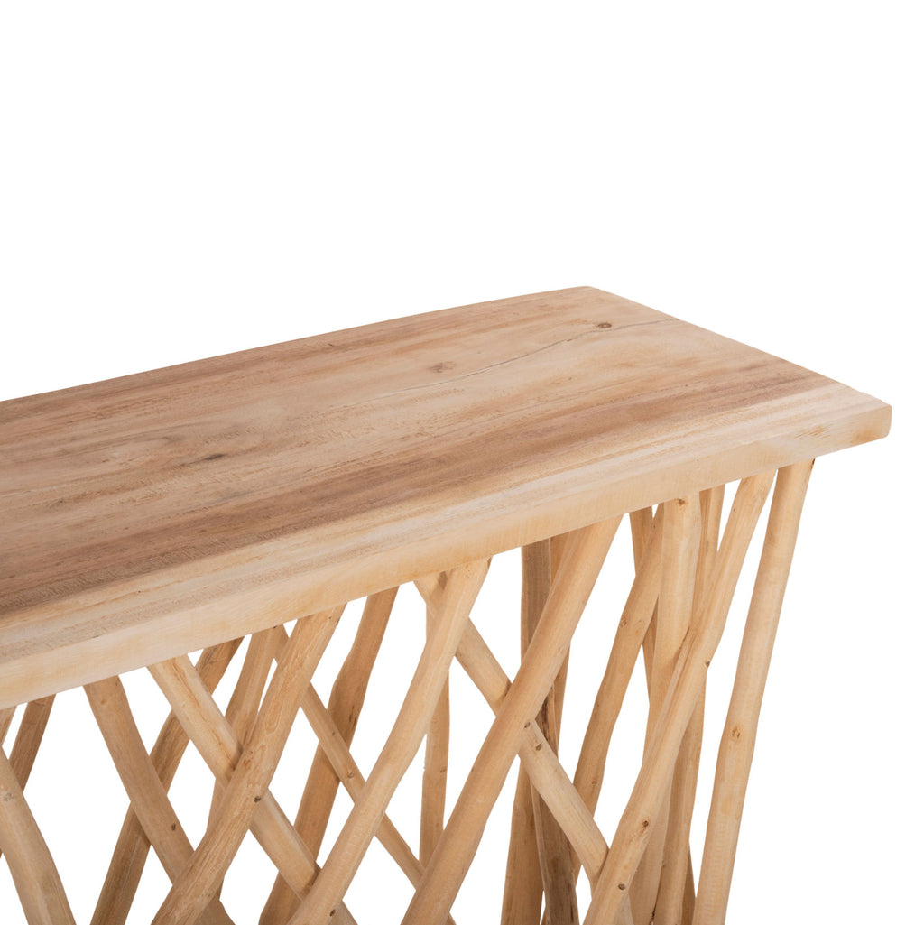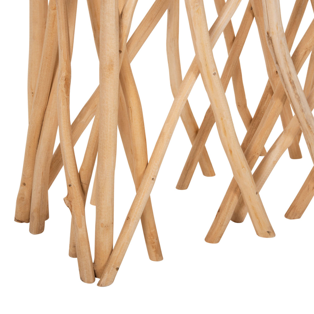 Конзолата е изработена от масивни клони на тиковото дърво. Масивната дървесина е вид дървесина, чиста и здрава, традиционно използвана от дърводелците за изработка на мебели. Масивната дървесина е най-скъпият избор от дървесни видове, но се откроява със своята вечна естетика. Ефектът, който предлага на притежателя си, е наистина уникален.