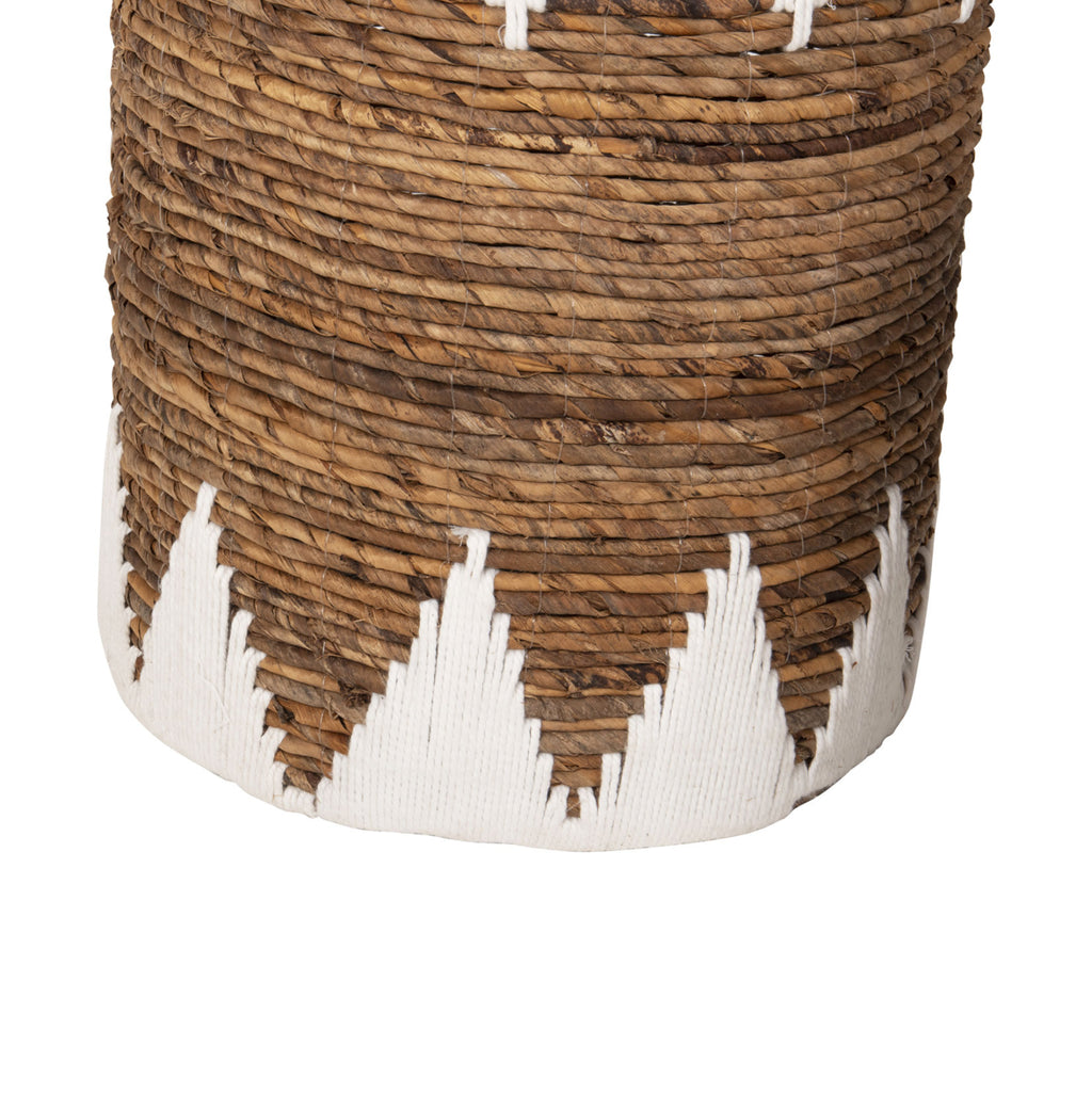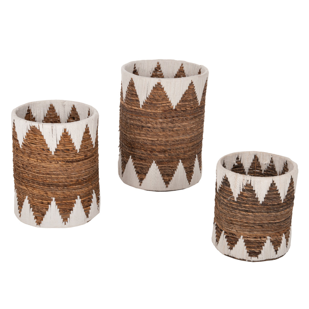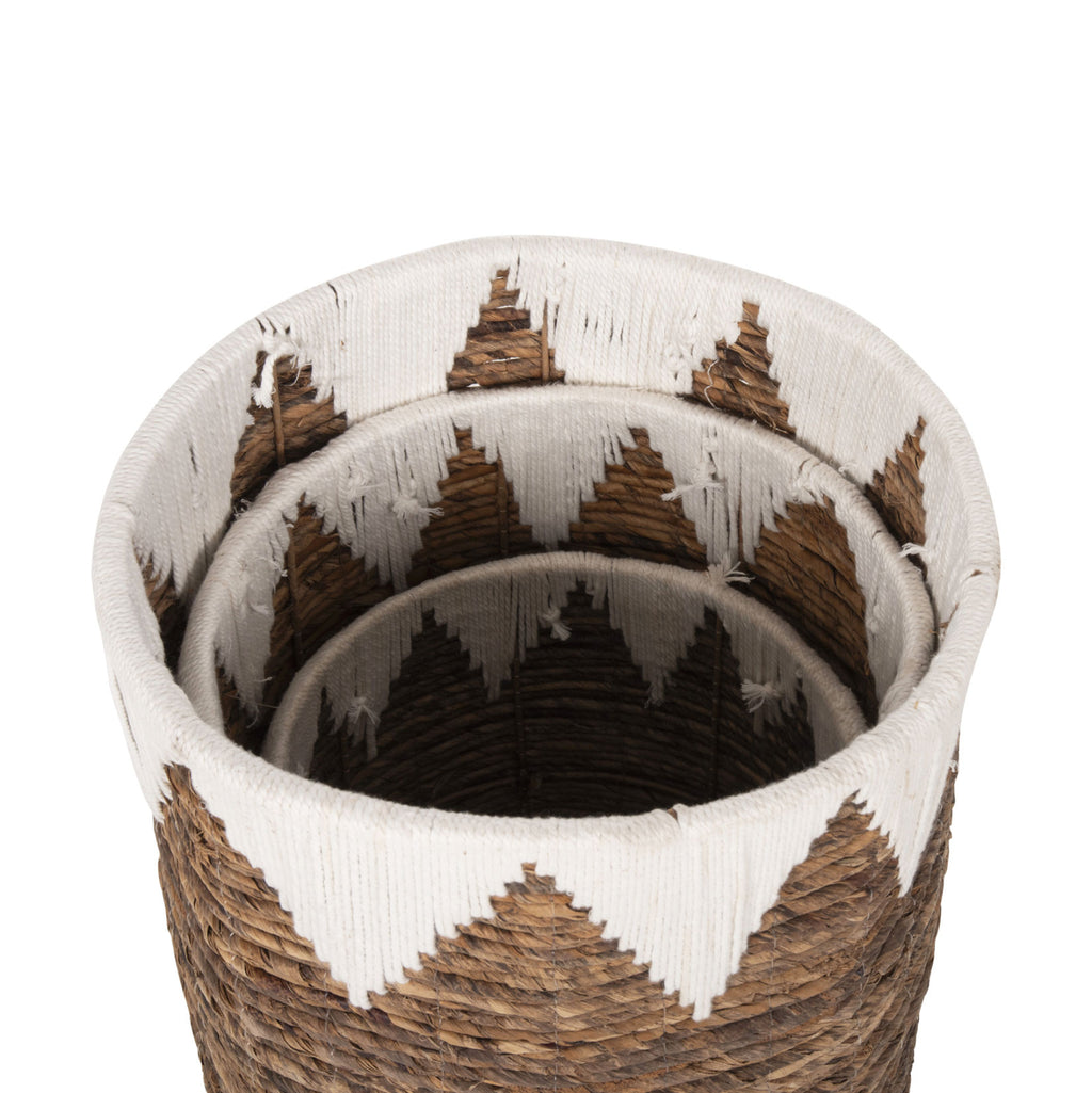Комплектът от 3 подови кошници КГ4307 се състои от 3 кръгли кошници в различни размери. Нямат капак и можете да ги използвате по различни начини, като са изработени от мат в натурален и бял цвят, майсторски изплетени. РАЗМЕРИ: Размери на голяма кошница: Φ42x56H см. Място за съхранение: Φ38,5x55 см. Размери на средна кошница: Φ36x47H cm. Място за съхранение: Φ33x45 см. Размери на малка кошница: Φ30x36H см. Място за съхранение: Φ28,5x35 см. ПОДДРЪЖКА: Необходимо е само почистване от прах и при необходимост почистване с влажна кърпа.