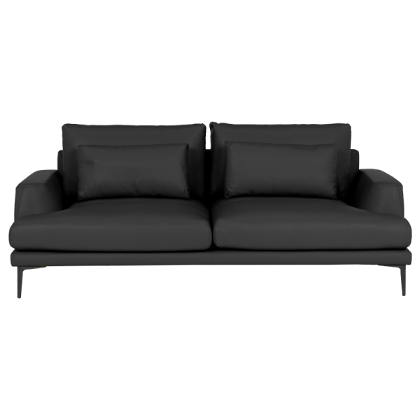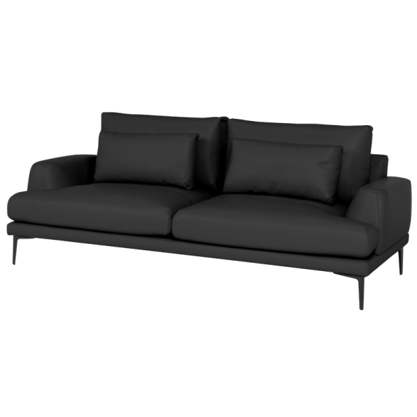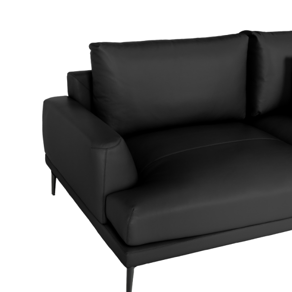 Комфортната тапицерия от еко кожа излъчва лукс и класа, а меката й повърхност е приятна на допир. Удобството на дивана е гарантирано от полиуретанов пълнеж и вградени пружини за отлична поддръжка на тялото при седене. Размерите му предоставят достатъчно широко и удобно място за трима души. Към основните възглавници на облегалката се добавят и две декоративни възглавници, които могат да се местят и позиционират според предпочитанията ви за максимален комфорт. Подлакътниците с леко скосен дизайн и заоблени линии допринасят за класическата елегантност на този модел. Металните крака не само подчертават модерната му визия, но и осигуряват стабилност и лесно почистване.