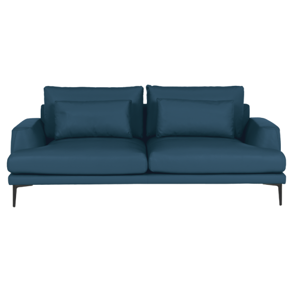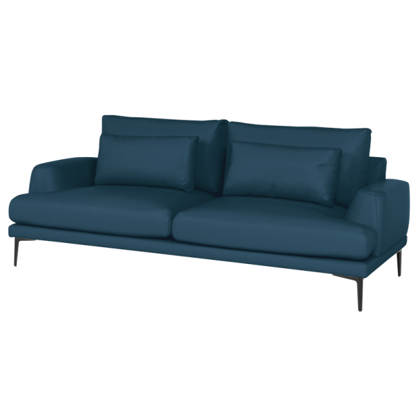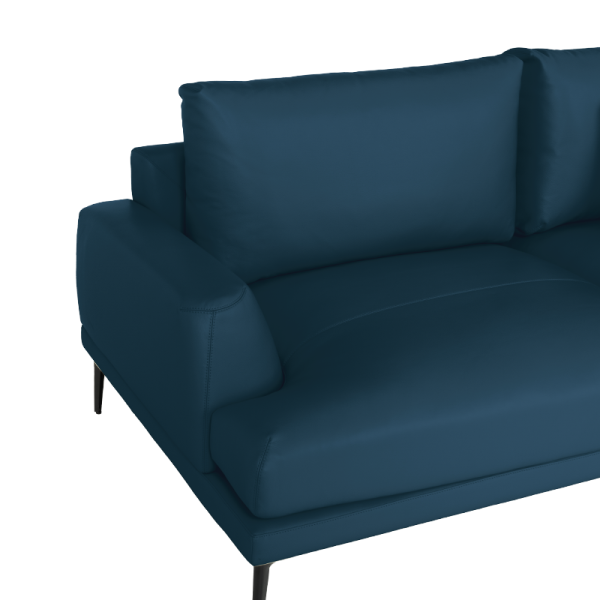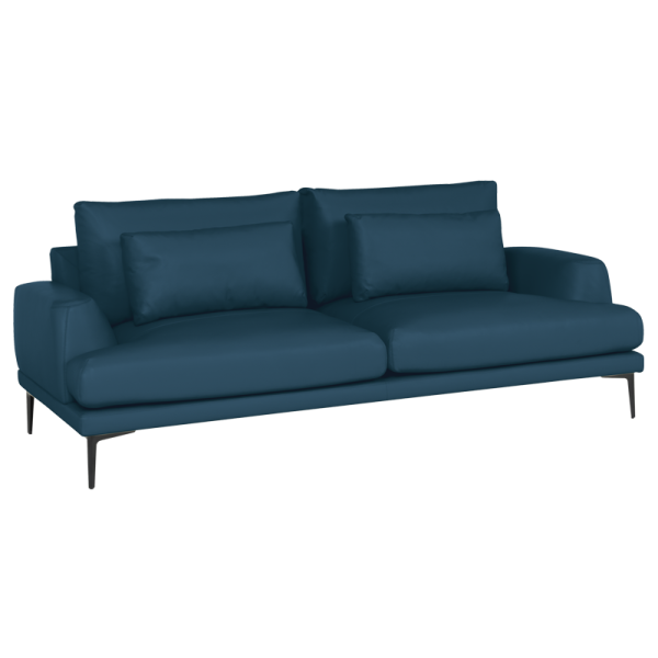 Комфортната тапицерия от еко кожа излъчва лукс и класа, а меката й повърхност е приятна на допир. Удобството на дивана е гарантирано от полиуретанов пълнеж и вградени пружини за отлична поддръжка на тялото при седене. Размерите му предоставят достатъчно широко и удобно място за трима души. Към основните възглавници на облегалката се добавят и две декоративни възглавници, които могат да се местят и позиционират според предпочитанията ви за максимален комфорт. Подлакътниците с леко скосен дизайн и заоблени линии допринасят за класическата елегантност на този модел. Металните крака не само подчертават модерната му визия, но и осигуряват стабилност и лесно почистване.